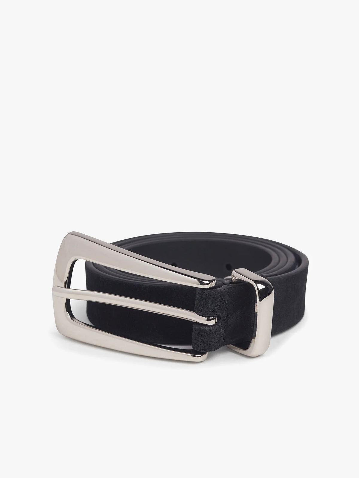 Crafted from black suede, The Statement Belt's 25mm flat strap has a leather lining and seven prong holes for a sleek look with extra adjustability. Our favorite part is the polished nickel hardware that makes every outfit a statement.