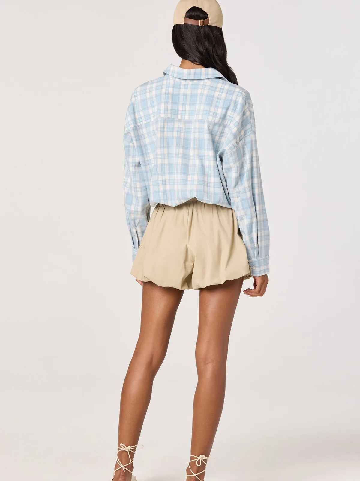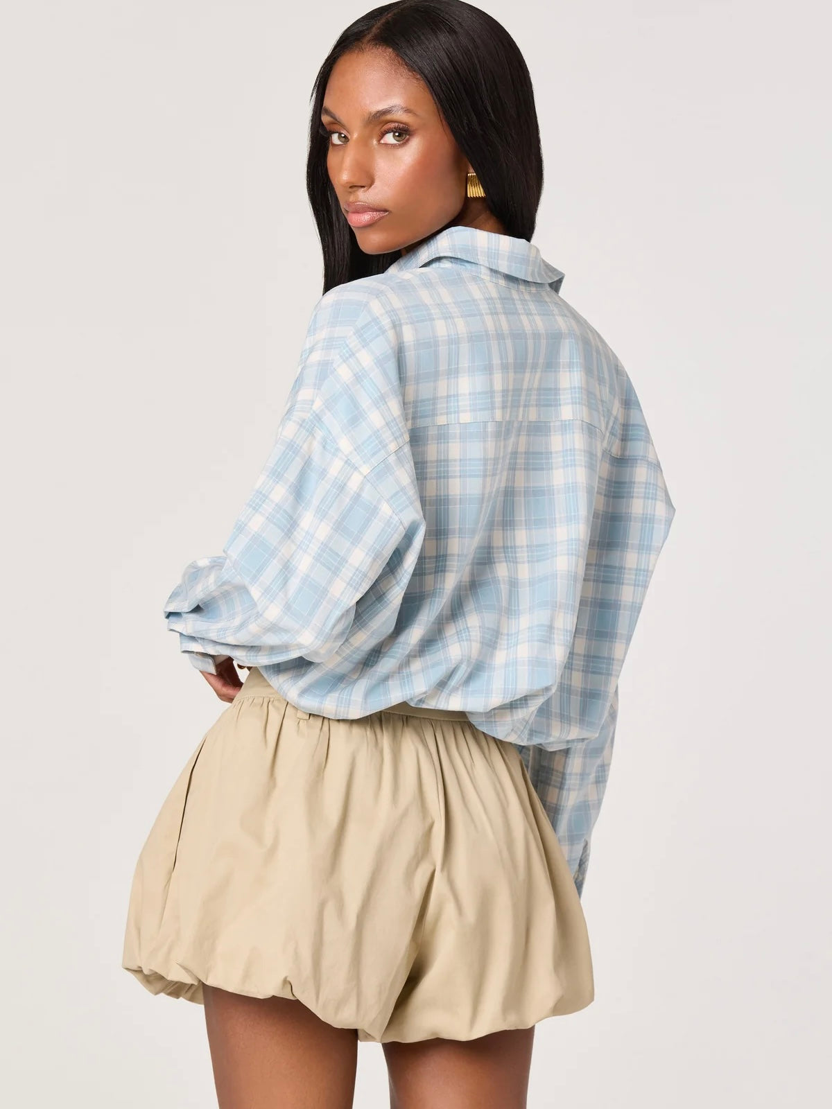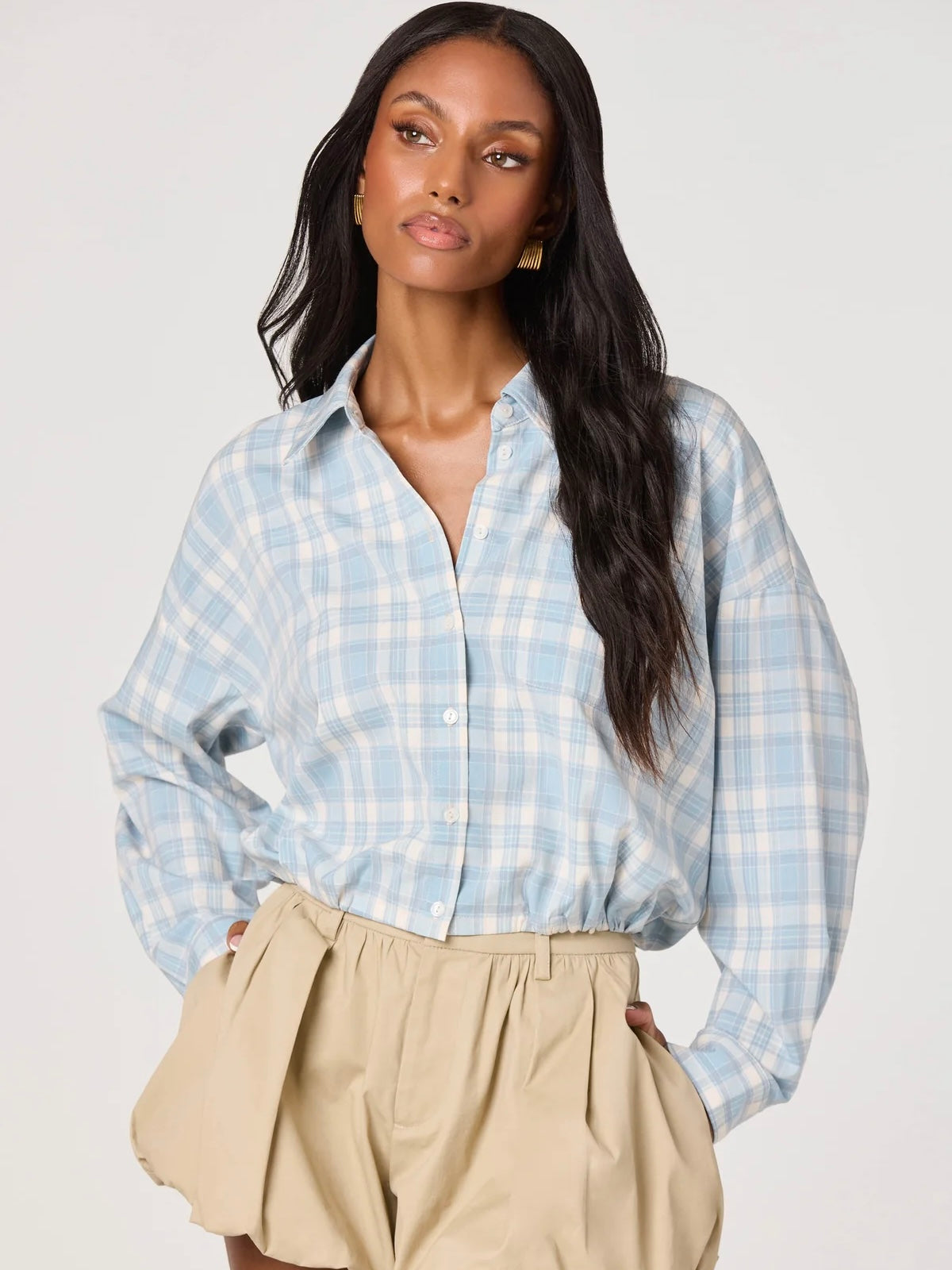 - Woven button-down shirt in plaid pattern