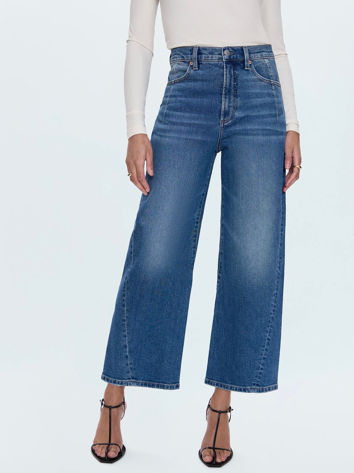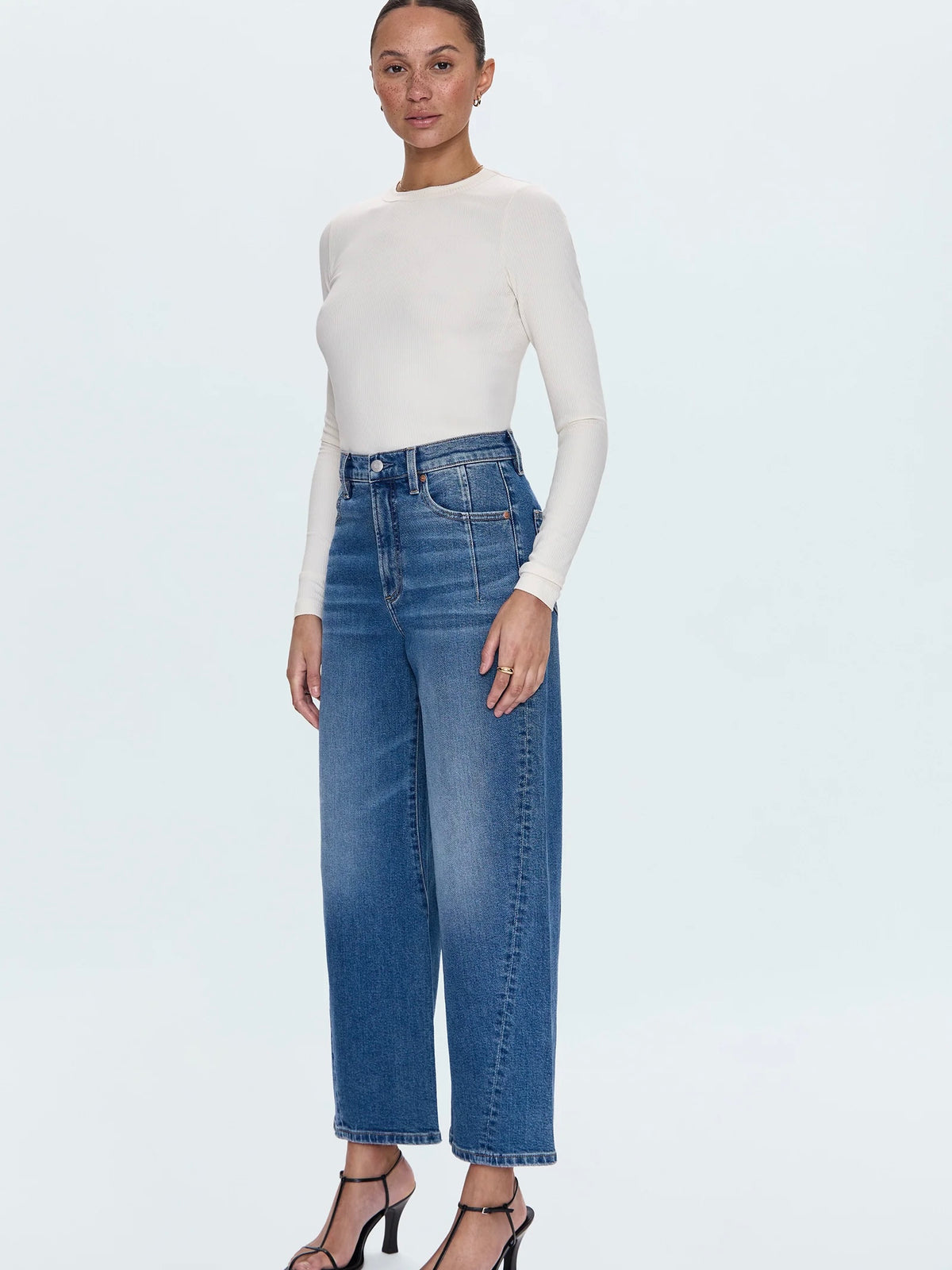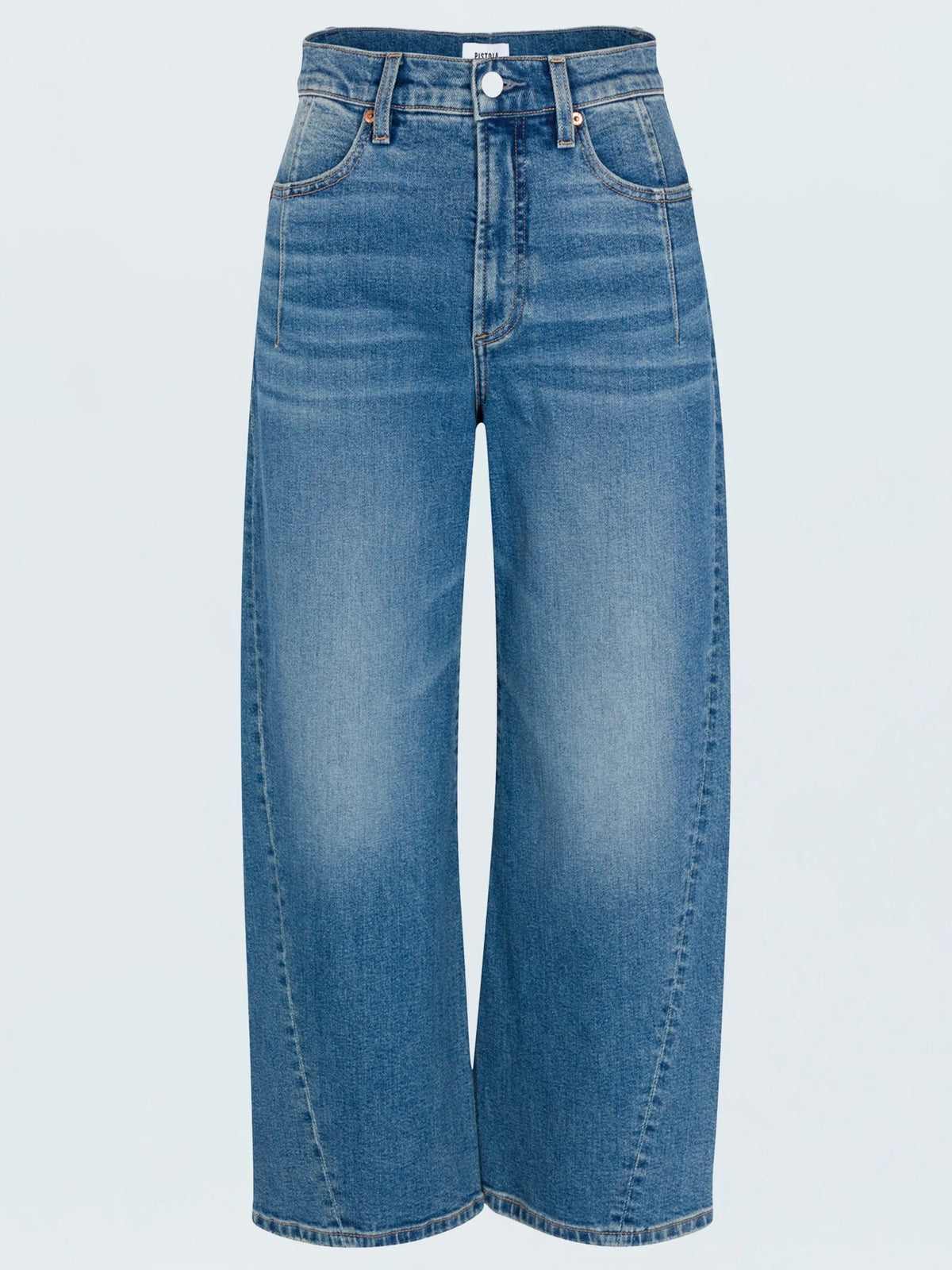 The new must-have jean with a twist. Kyra sits confidently at a high rise with our signature bowed leg silhouette and cropped 28" inseam. The subtle curve creates dimension while the wide ankle opening adds modern proportion with a new wide angle for the season. Fashion detail seaming, including a twisted seam that moves forward and yoke seams in the back, brings modern denim classic sophistication. Crafted from our signature comfort stretch denim in Soho, a medium vintage wash with subtle fading that feels both contemporary and timeless