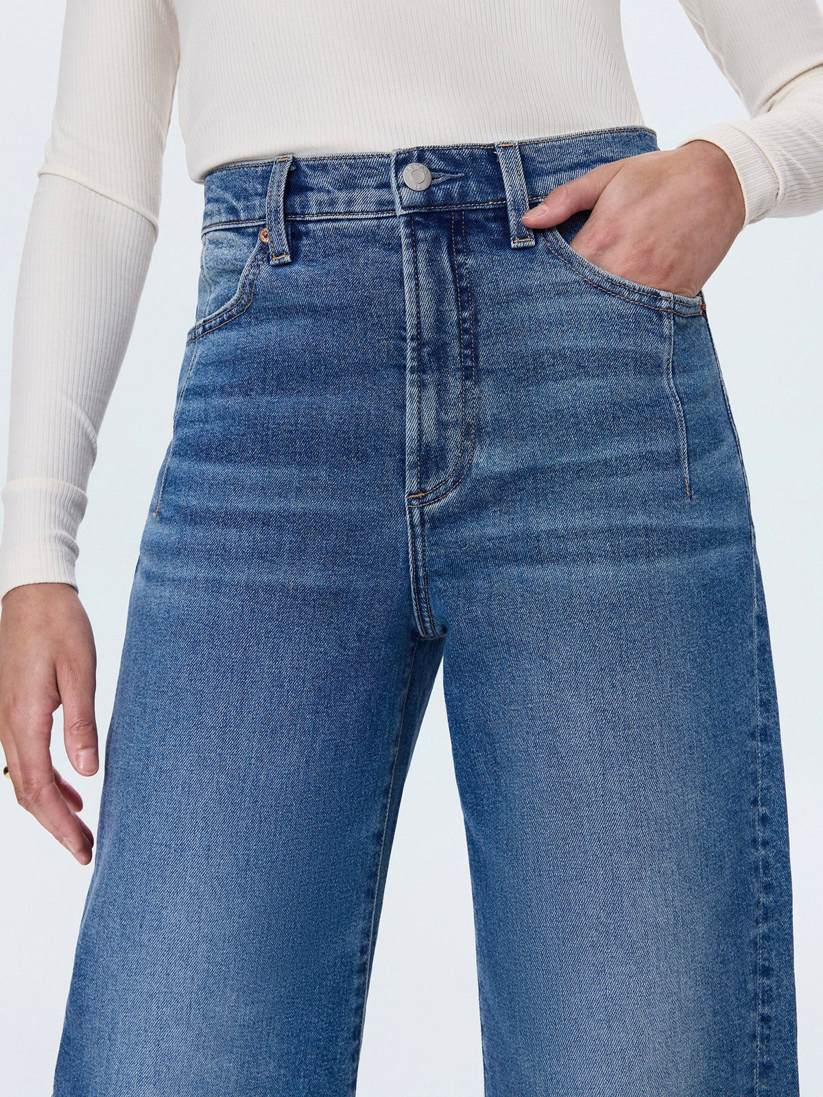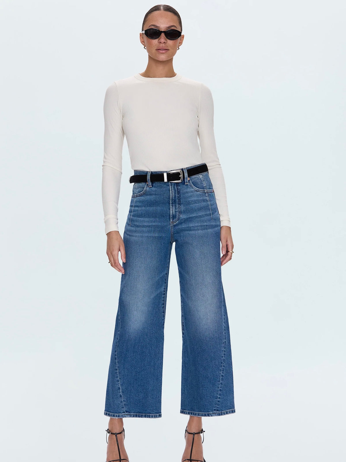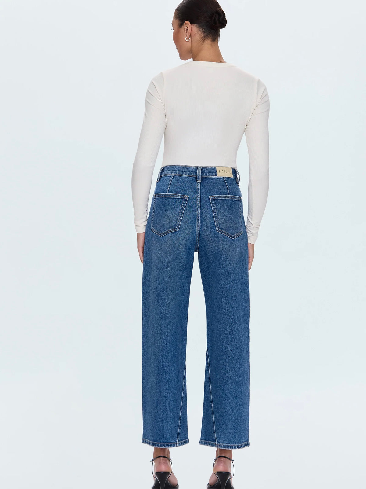 The new must-have jean with a twist. Kyra sits confidently at a high rise with our signature bowed leg silhouette and cropped 28" inseam. The subtle curve creates dimension while the wide ankle opening adds modern proportion with a new wide angle for the season. Fashion detail seaming, including a twisted seam that moves forward and yoke seams in the back, brings modern denim classic sophistication. Crafted from our signature comfort stretch denim in Soho, a medium vintage wash with subtle fading that feels both contemporary and timeless