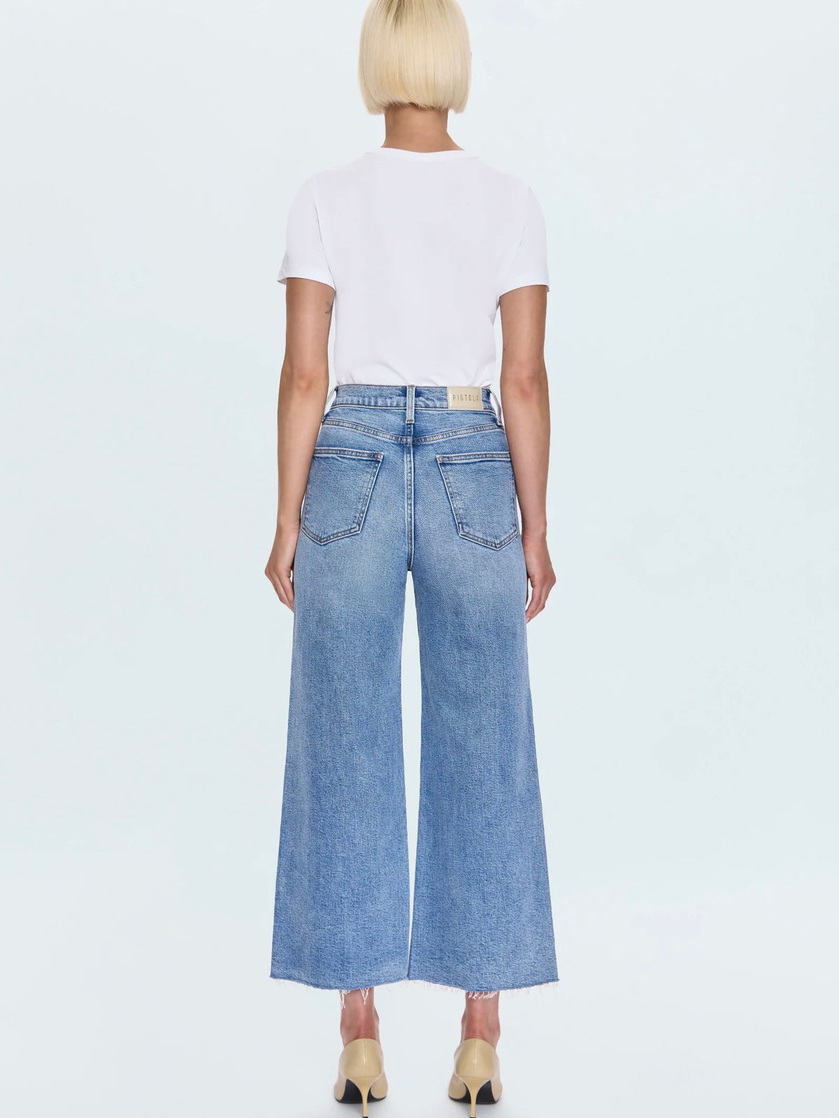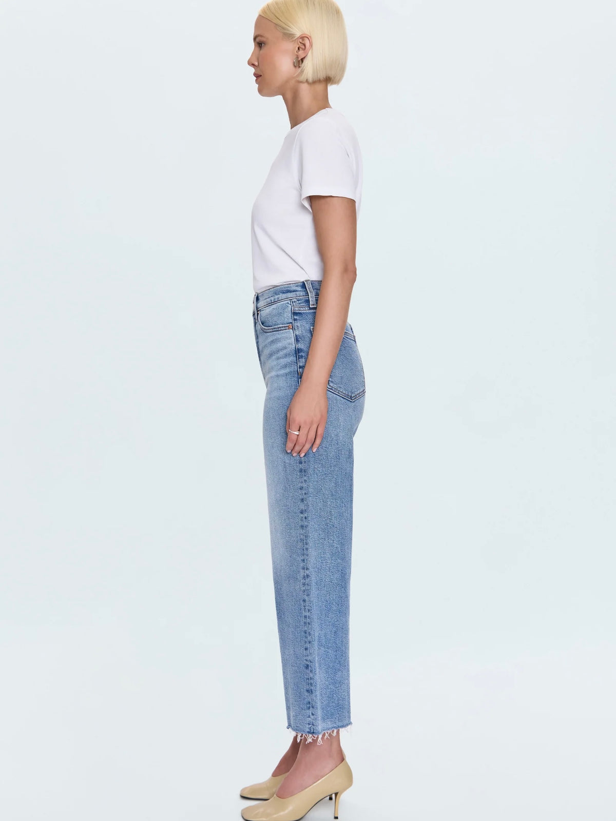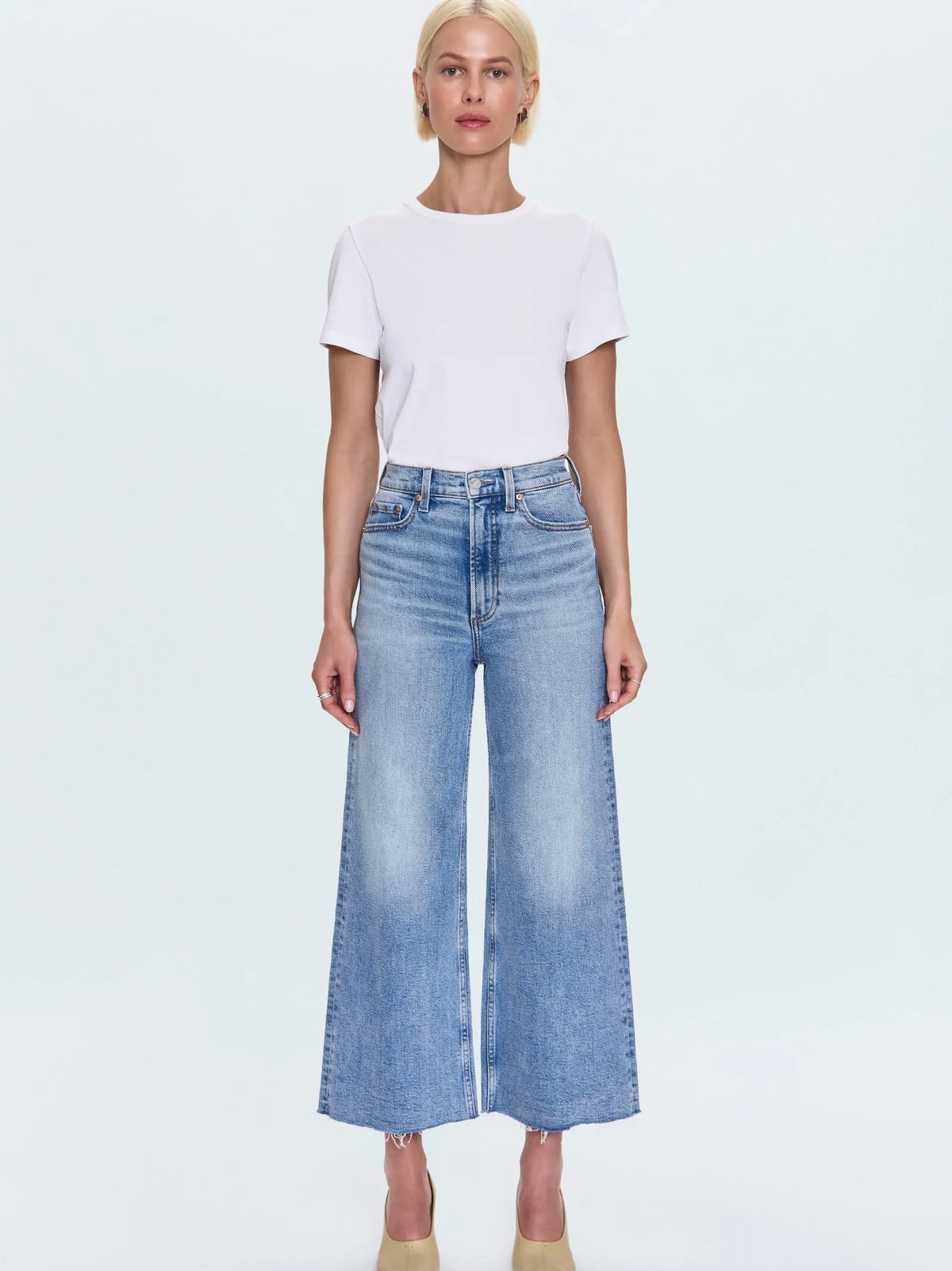 The wide leg that commands the room. Lana Crop delivers our ultra wide leg silhouette with a high rise and breezy cropped inseam, expertly redesigned for smaller frames. Featuring a raised thigh and knee break with reduced front and back rises that create perfect proportions. The raw finished hem adds authentic texture while the relaxed fit creates effortless impact.