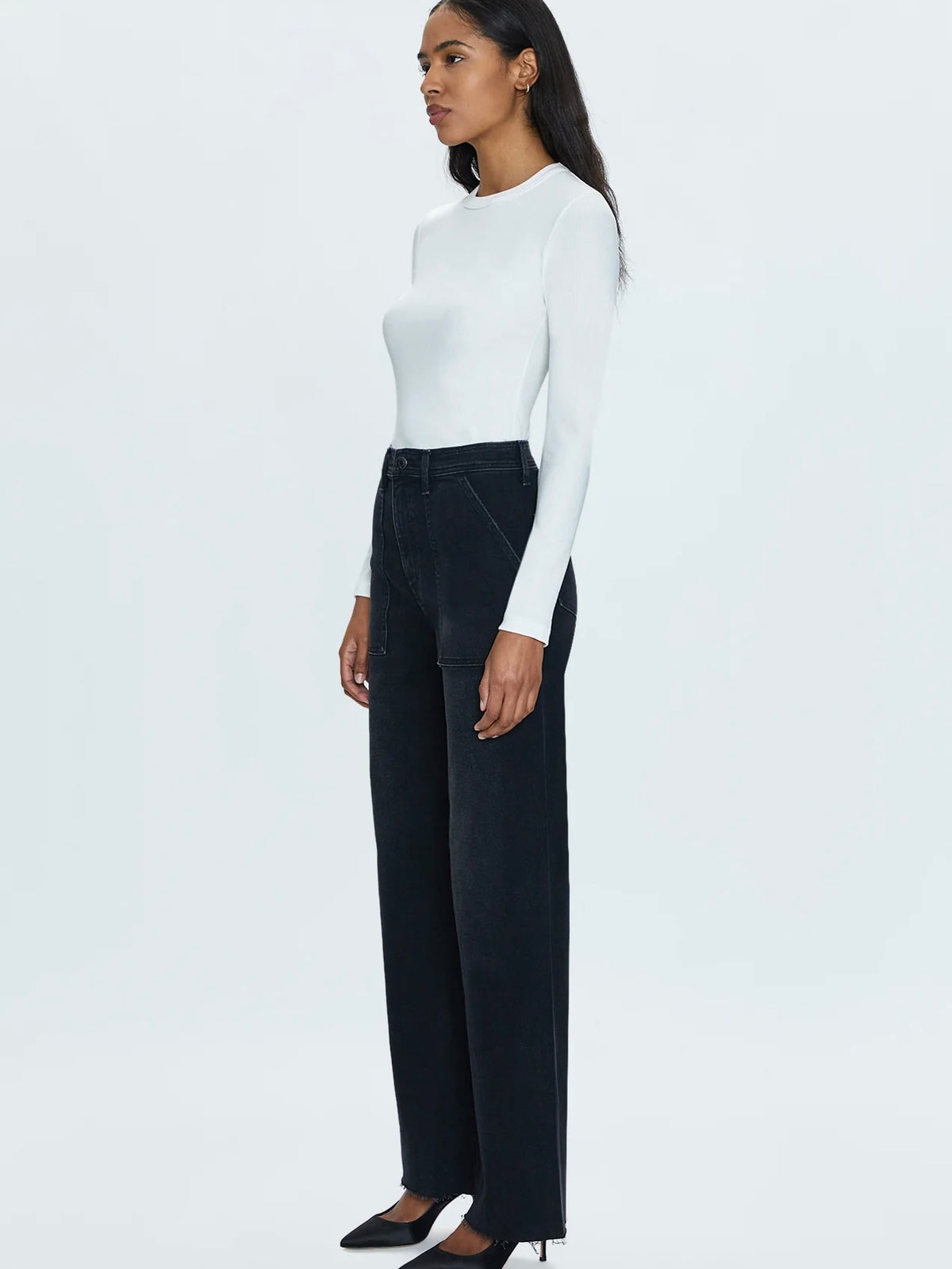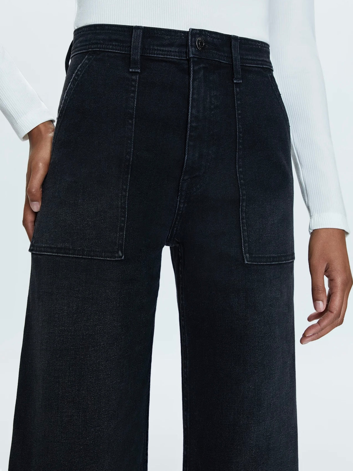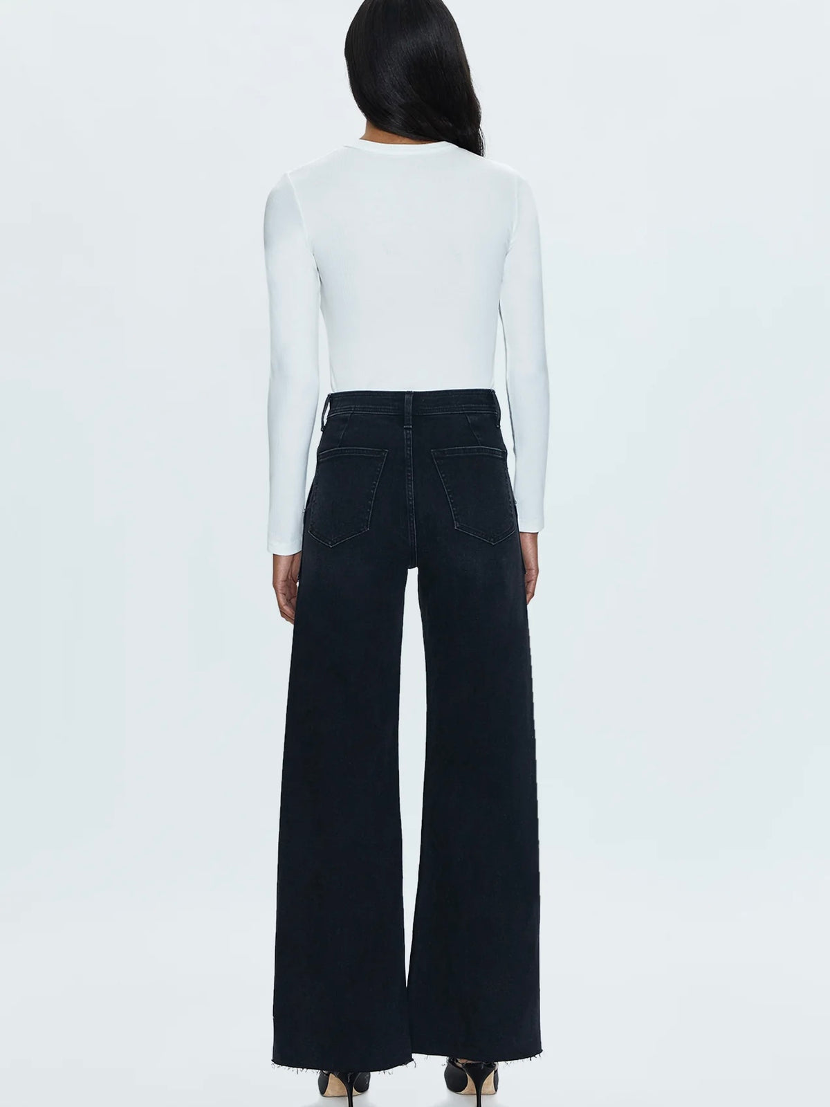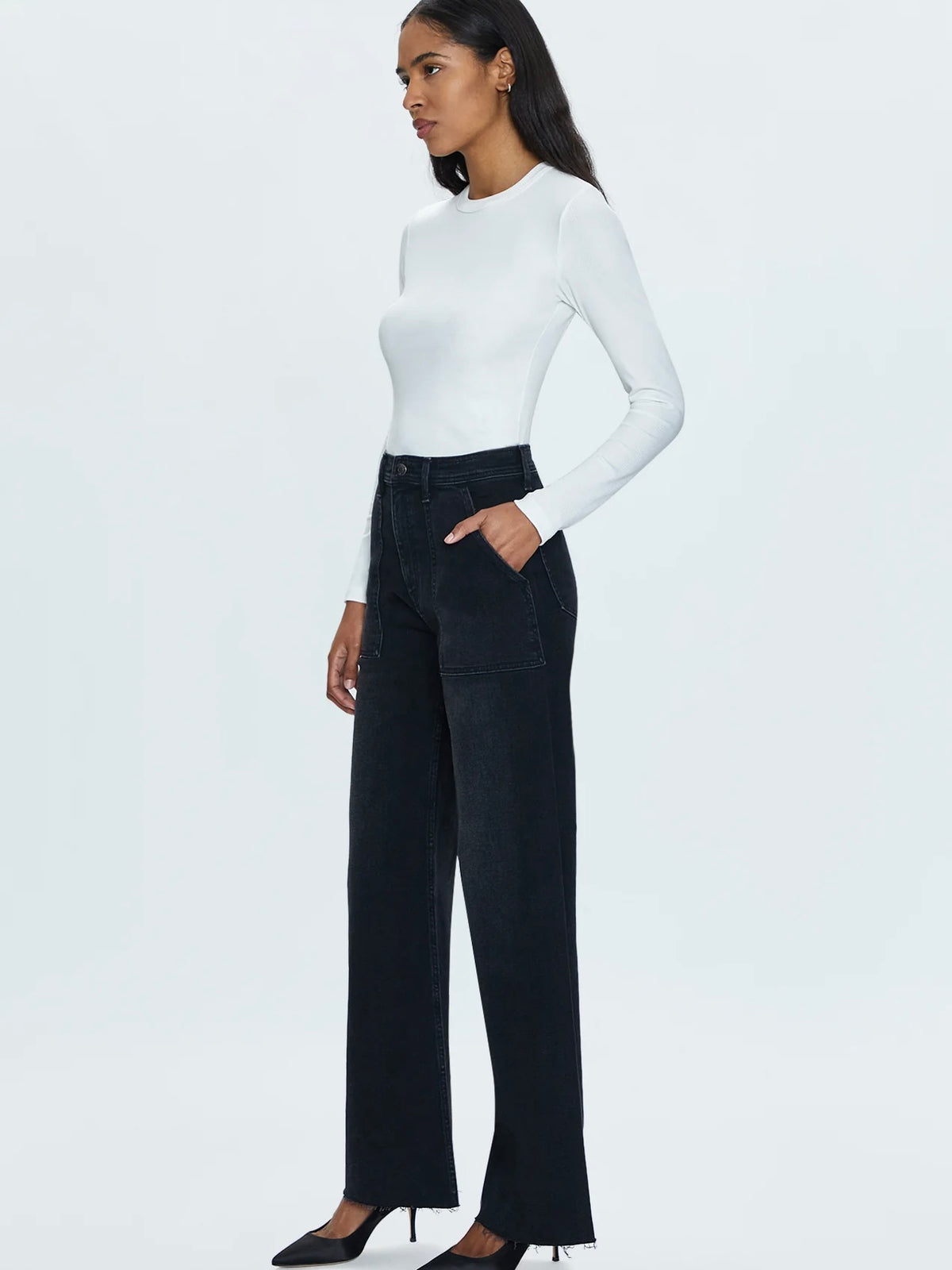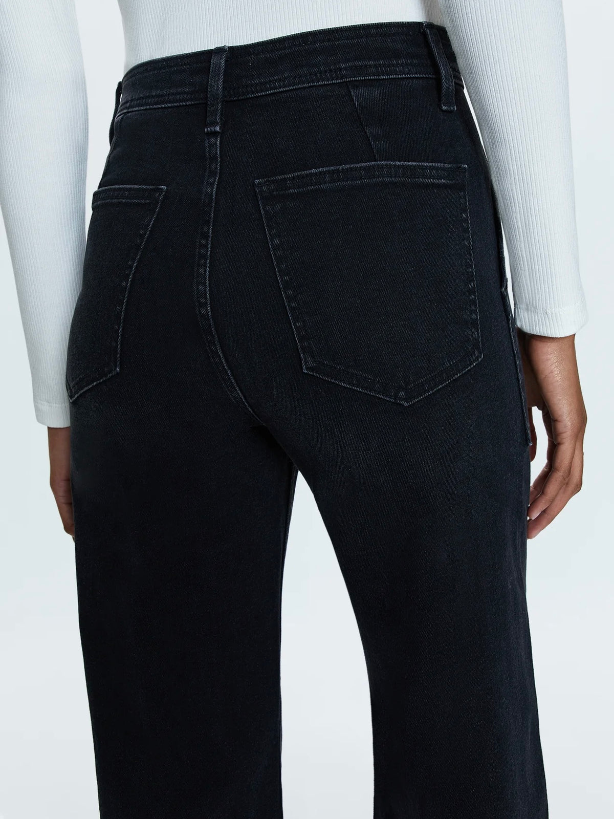 The wide leg that changes everything. Penny sits at a high rise with an ultra wide leg silhouette and full-length 32" inseam. Designed with no side seams for a clean, seamless silhouette that flows beautifully. The relaxed wide leg moves with intention while the high rise anchors the proportions perfectly. Utility-inspired details add functional appeal to the contemporary silhouette. Crafted from our comfort stretch denim in Collins, a rich black wash.