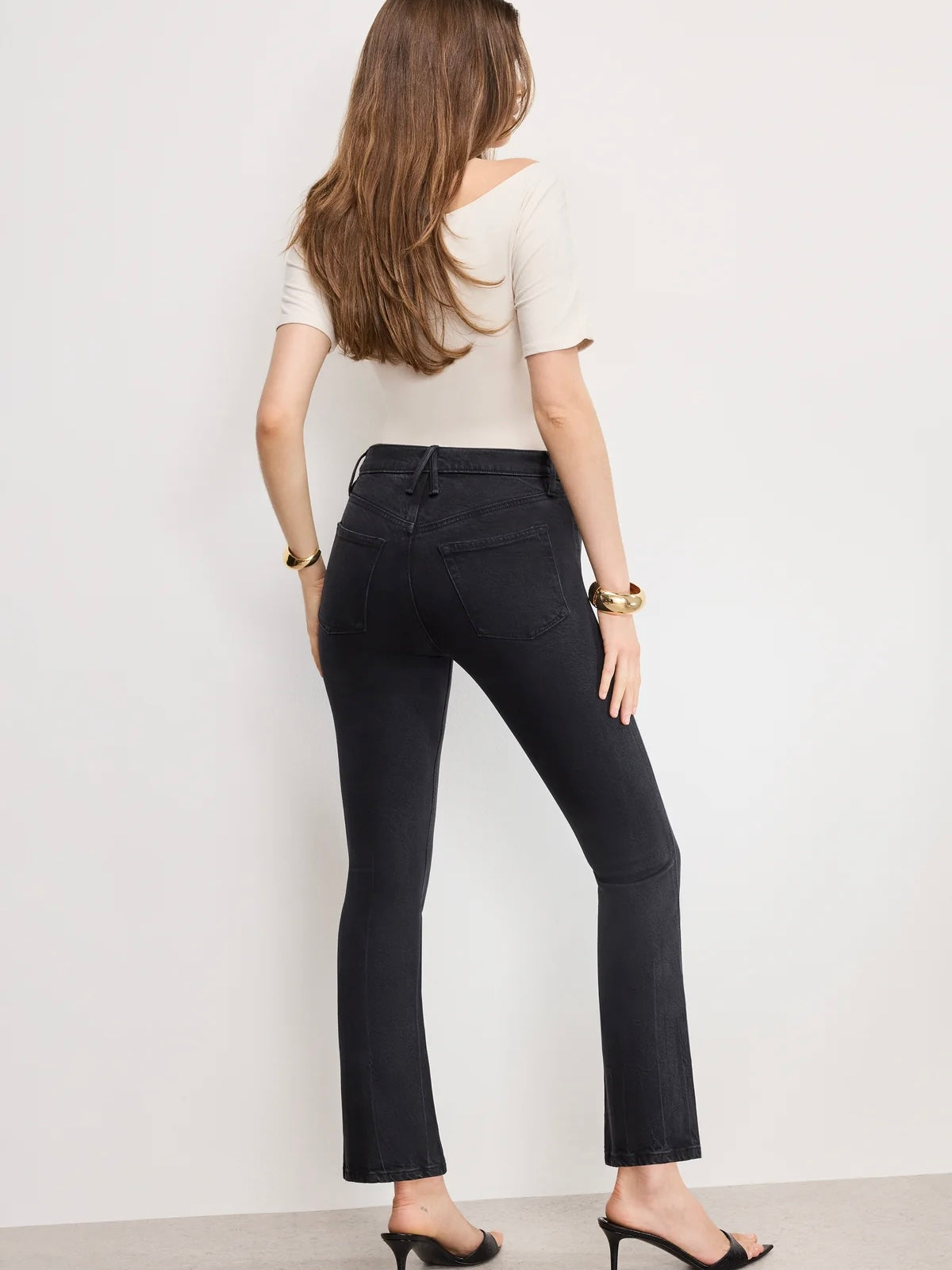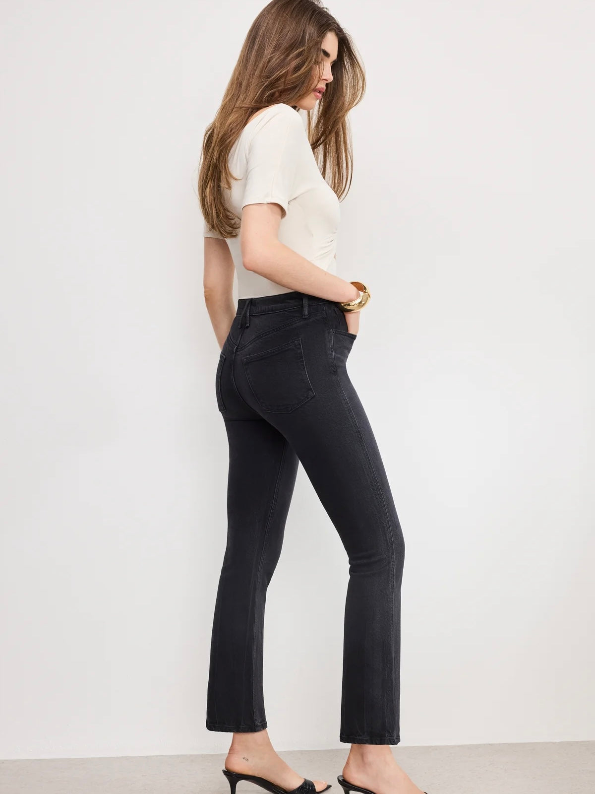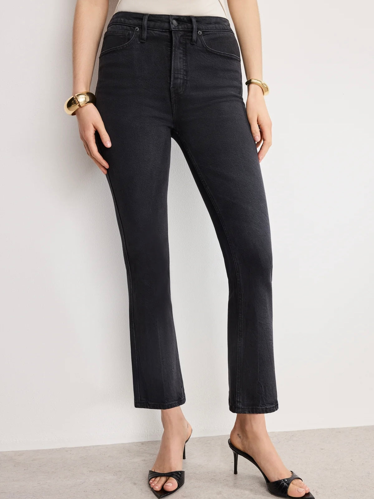 The ultimate statement jeans, featuring a high-rise waist, a raw hem, and a flattering kick flare silhouette.