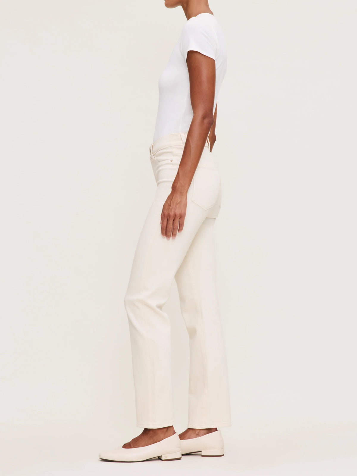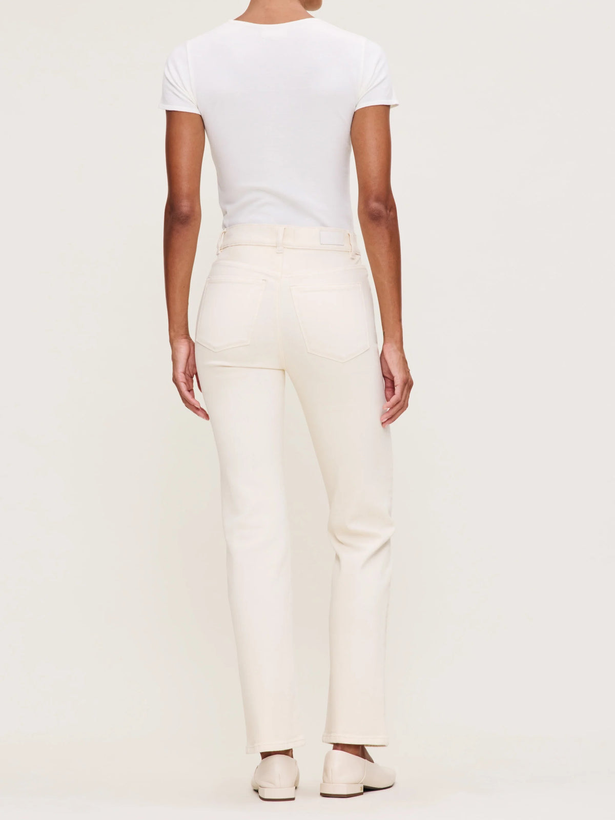 Ecru is a natural colored denim. It features gold hardware, tonal stitching, a clean hem and an ecru back patch.