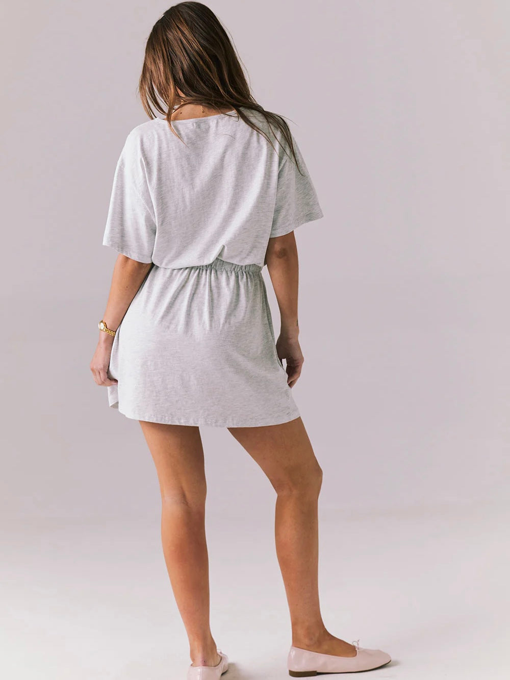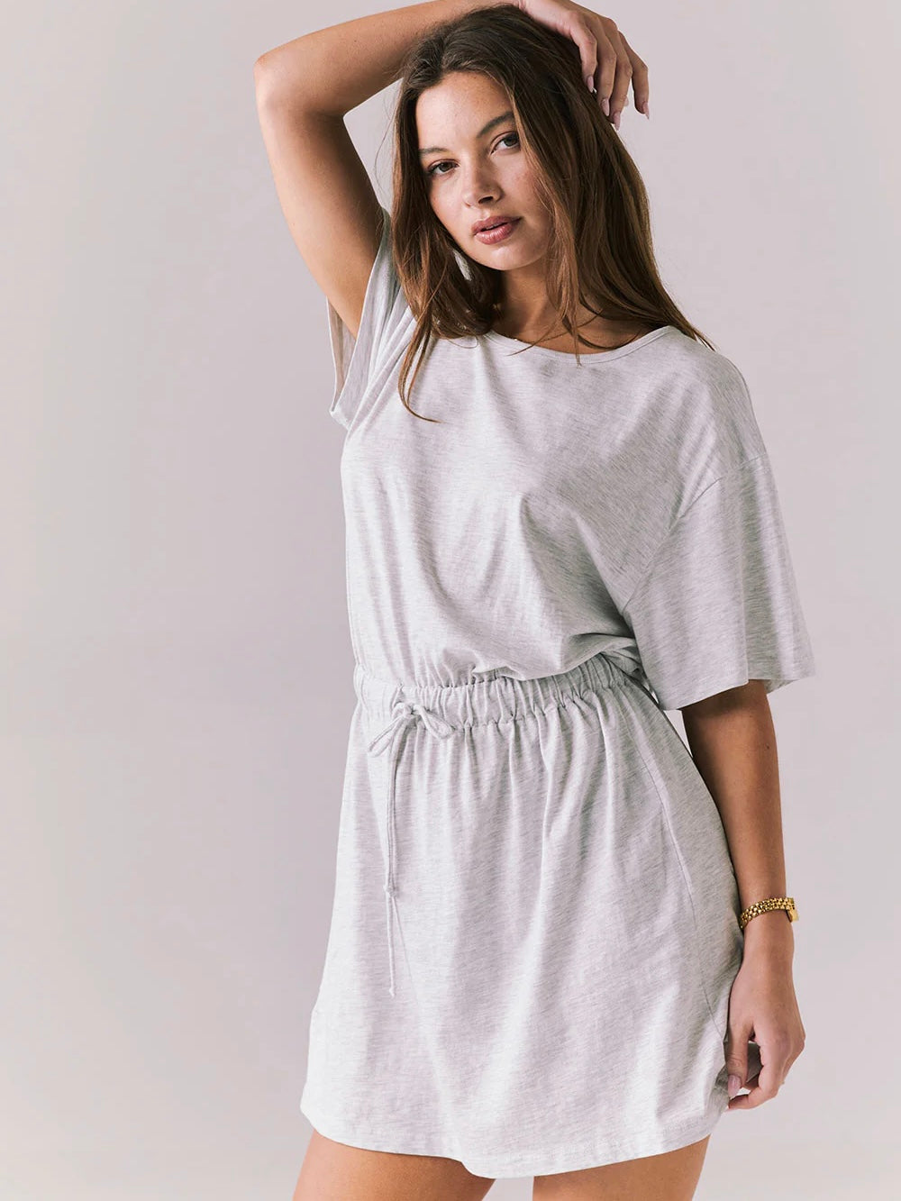 Inspired by 90s aerobics styles, this Light Heather Grey t-shirt dress features a pull tie at the waist for a fun and playful look.