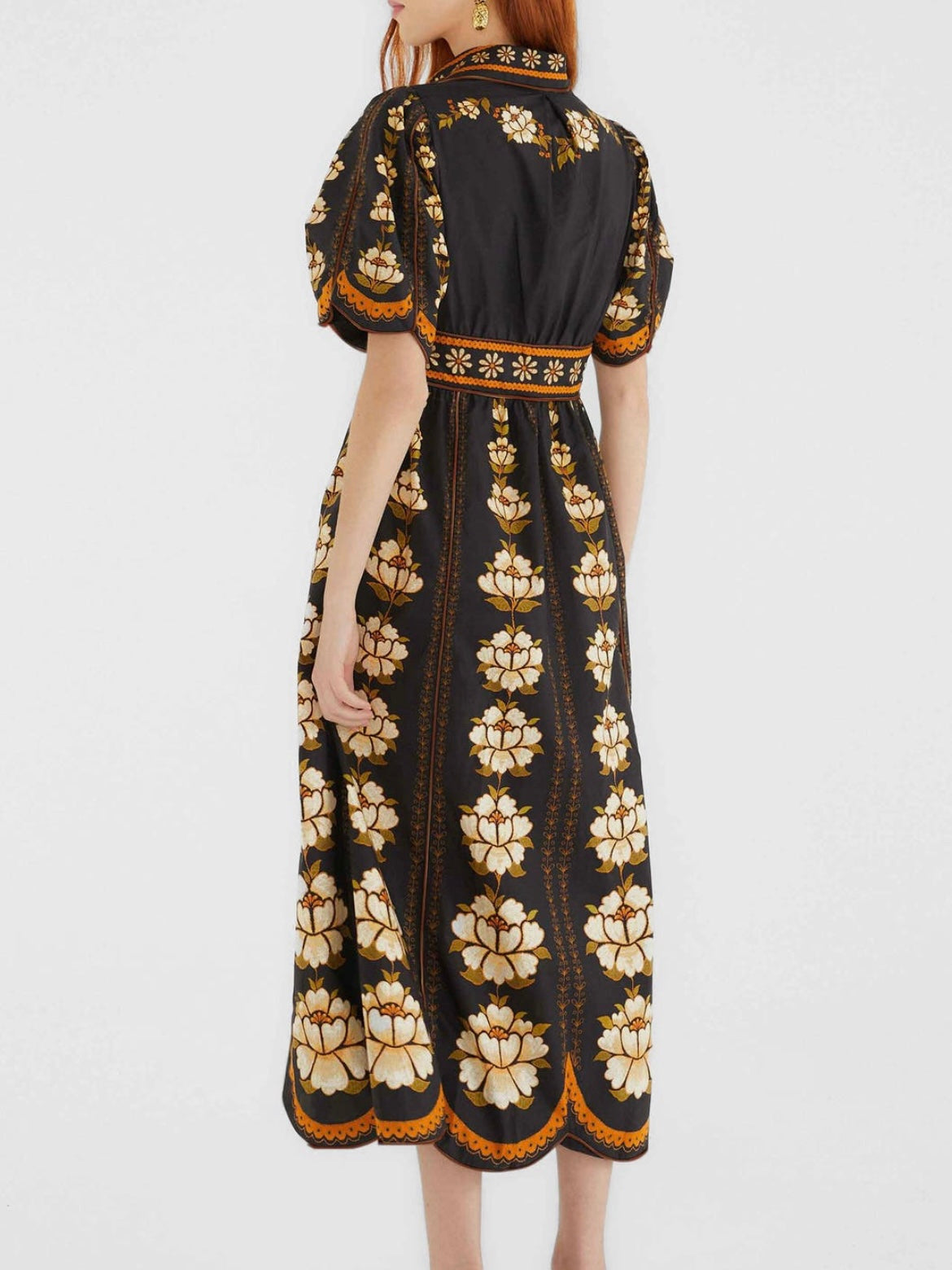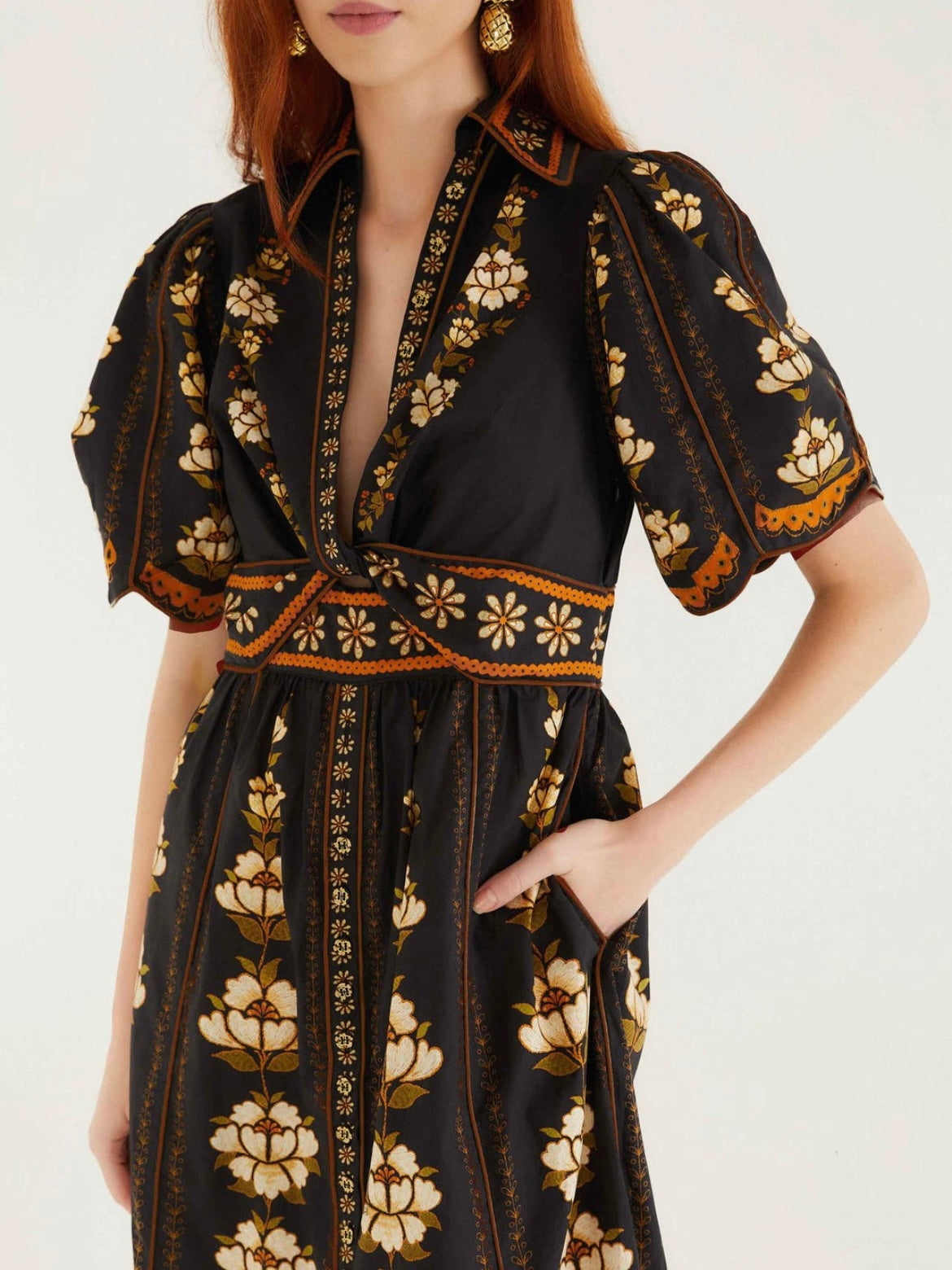 Blossom with elegance in this enchanting dress framed by scalloped hems and petal-shaped sleeves that echo a floral silhouette. Embroidered blooms dance across every inch of the pure cotton fabric, and a V-neck with a spread collar adds a touch of tailored romance.