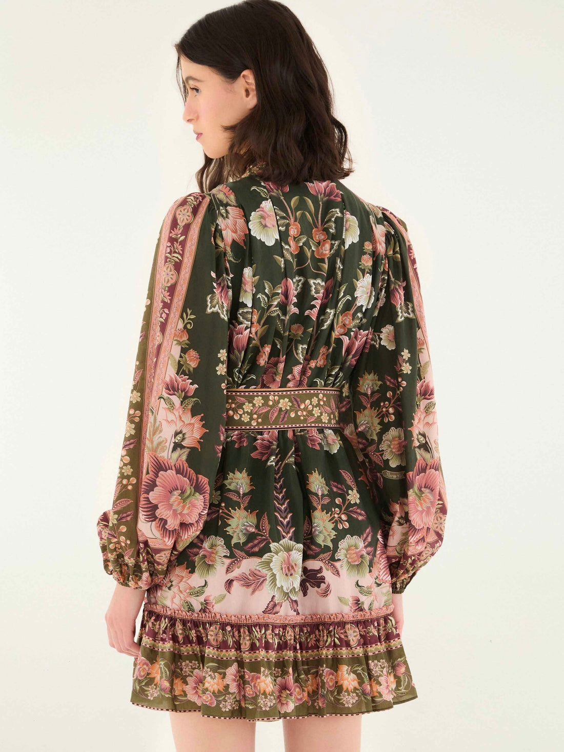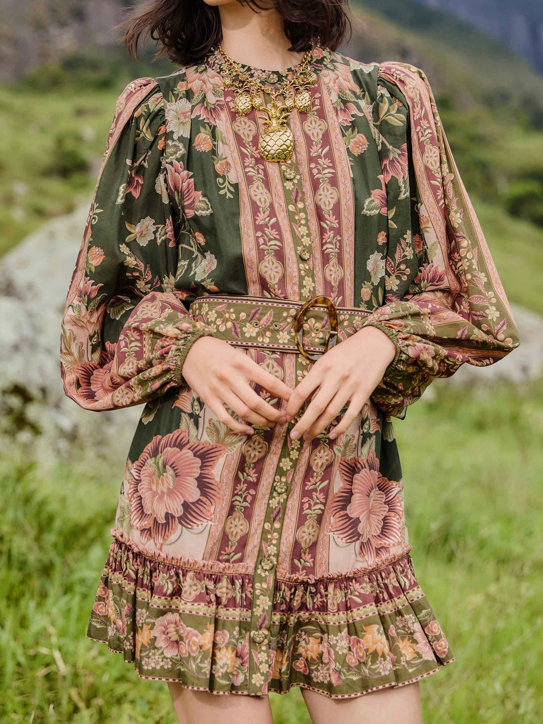 The Green Flowering Garden Tree Mini Dress invites you into a whimsical botanical world with its rich green and soft pink floral print. A structured high neckline complements voluminous puff sleeves, while the cinched waist with a matching belt frames a playful silhouette. Delicate ruffles skirt the hem, adding movement and charm to this enchanting mini dress, perfect for sparkling in sunlit gardens or lively city adventures.