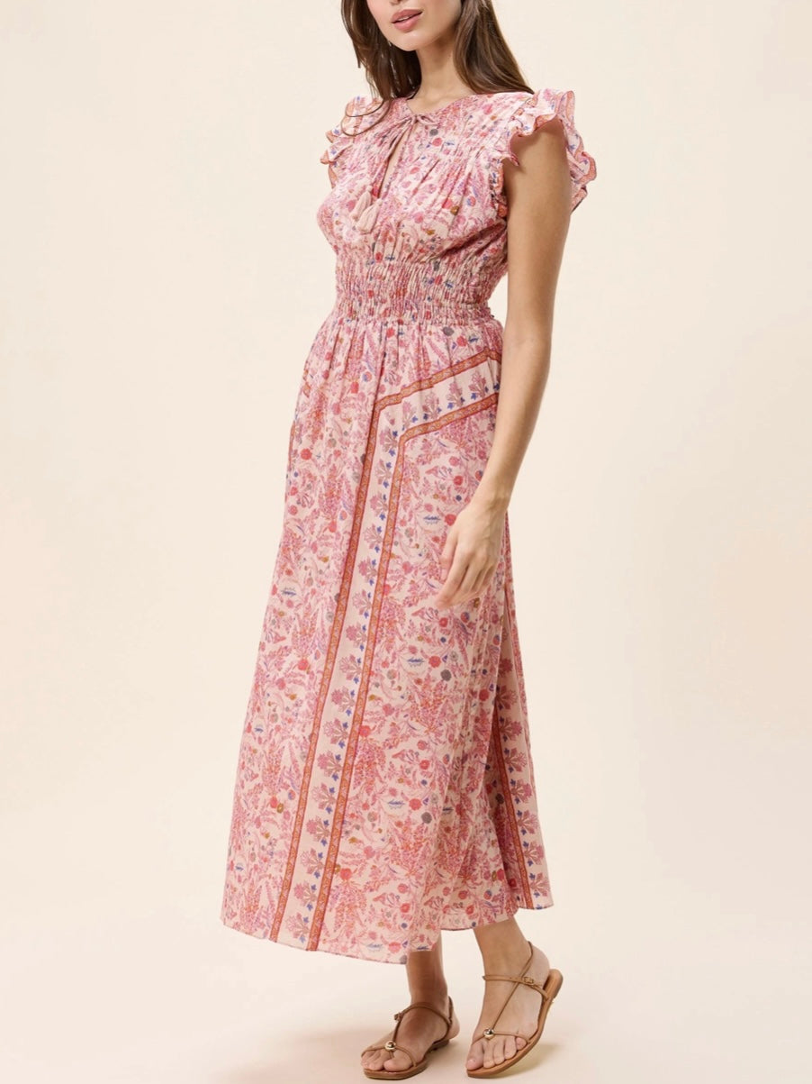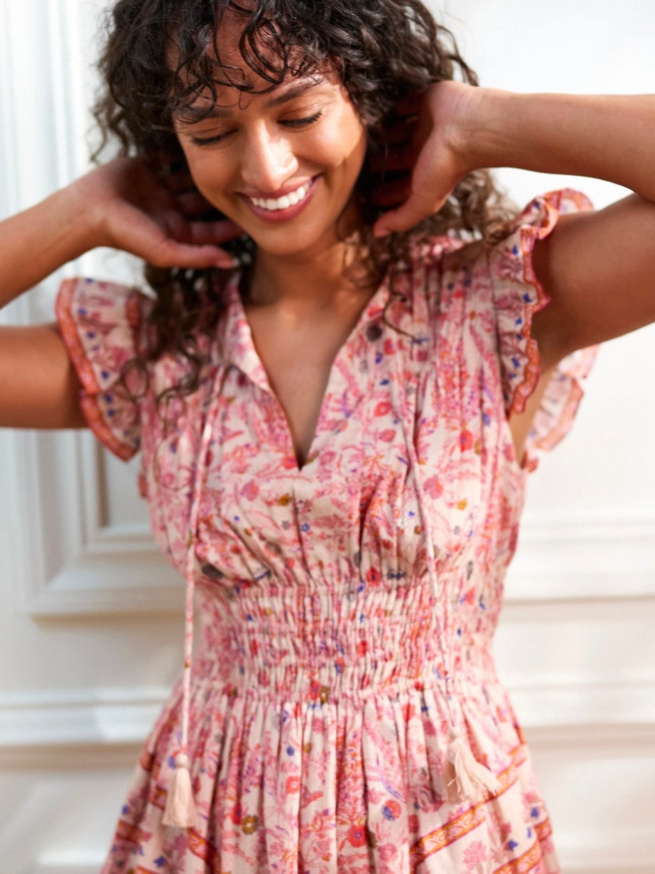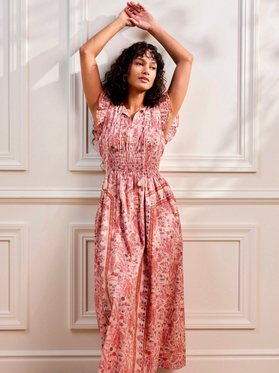 Ethically made in India from GOTS-certified organic cotton mul mul, the Jonni Ankle Dress is designed with a high neckline and fluttering sleeves. The double elastic waist offers comfort and shape, making it an effortless choice for any spring occasion.