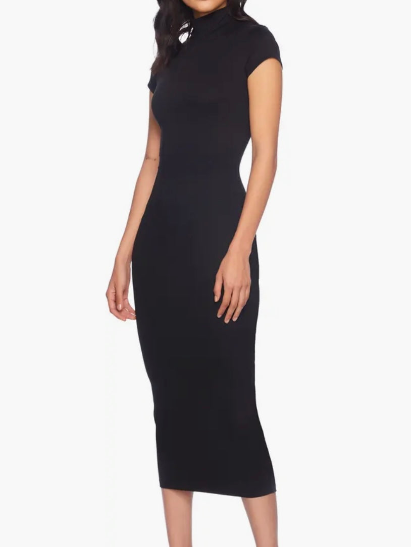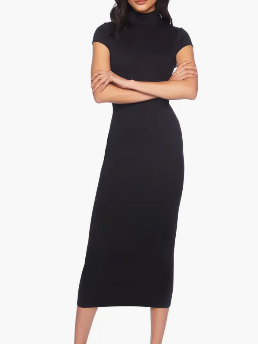 Move stylishly from desk to dinner in this close-fitting midi designed with a sophisticated mock neck and abbreviated sleeves.