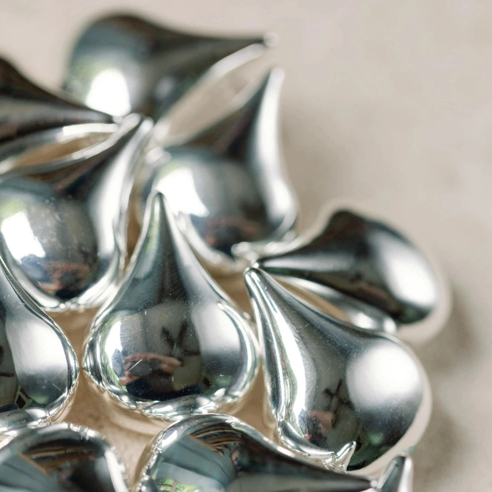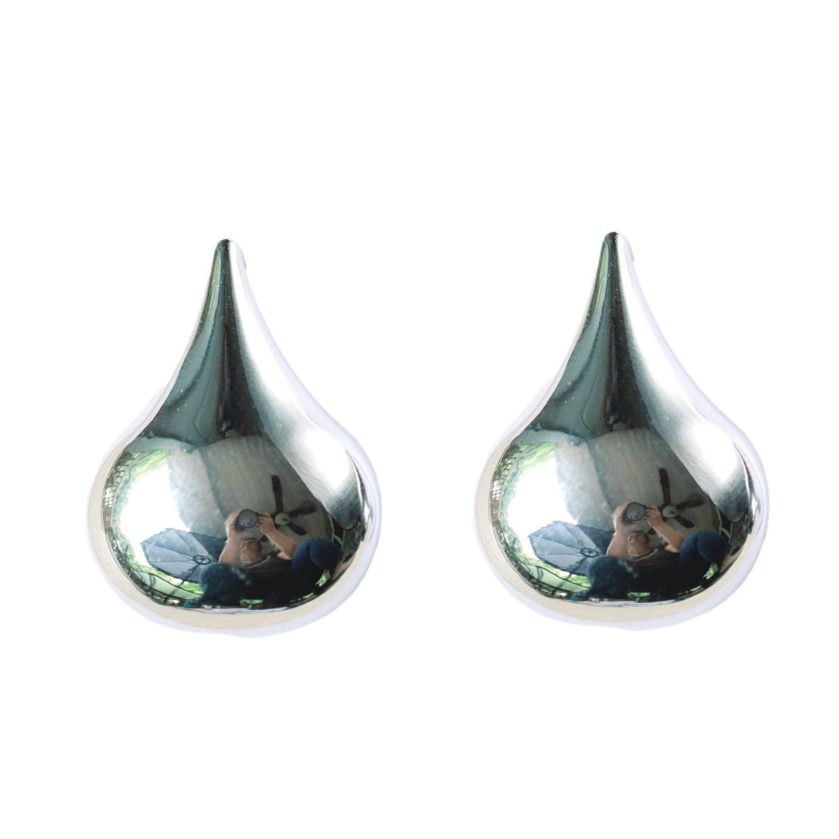 Our new chunky teardrop earrings in silver-plated brass feature a chunky base with an elongated center, adding a touch of on-trend sophistication to any outfit. Their polished finish and bold design, perfectly sized a 1”, make them a great basic for all seasons.