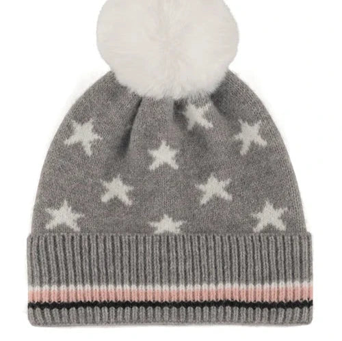 Show off your spirit with the stars and stripes on the Stella Beanie. This thick knitted beanie is the perfect cold weather accessory for frigid game day events. The fabric features a cute neutral pattern of white stars on a grey background, with a line of pink, white, and black stripes on the hem and a white pom-pom detail. Whether you’re wearing it to a sporting event or a snow day outing, it’s sure to match all of your cold weather outfits seamlessly.