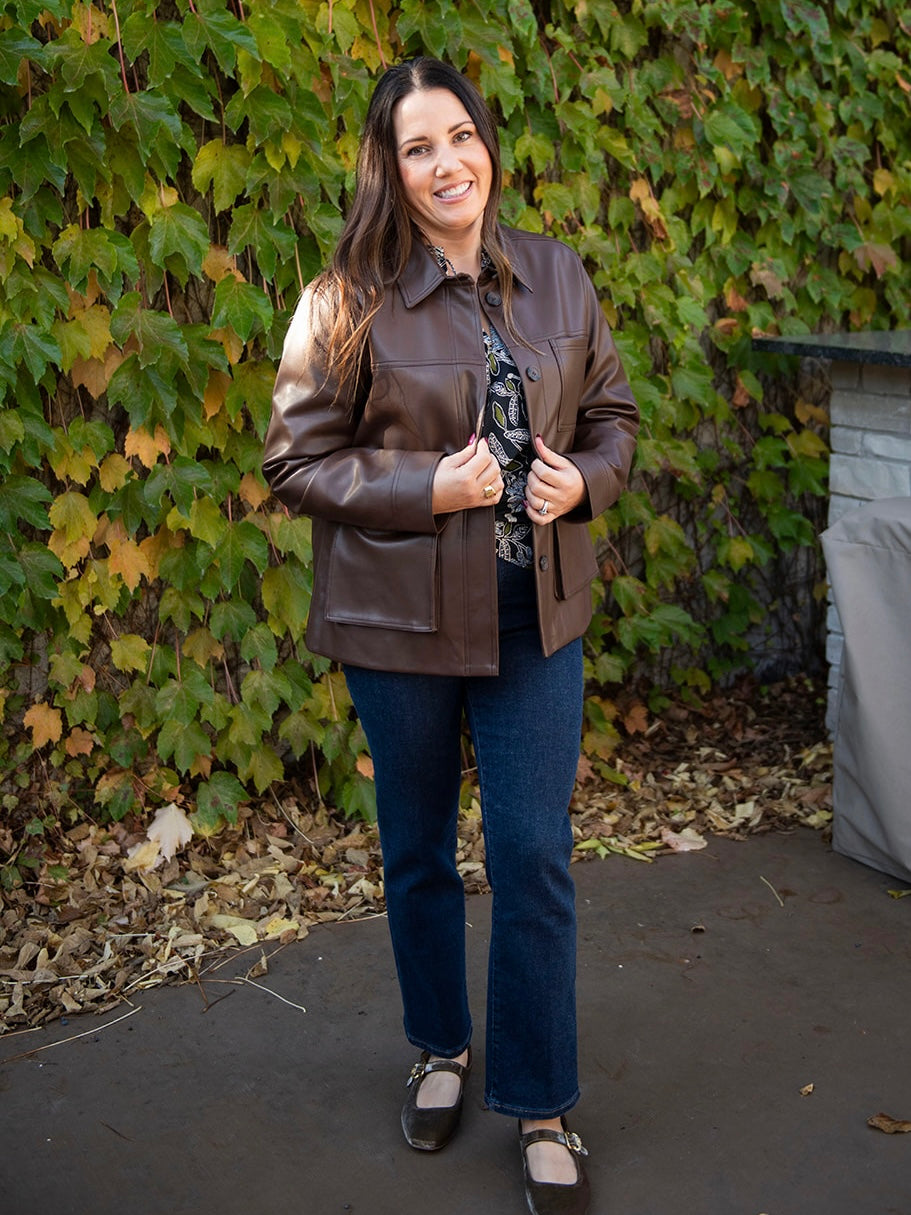 The Telsey Faux Leather Jacker is made from PU leather and has a smooth, buttery finish. The silhouette is relaxed with a drop shoulder and length finishing above the hips. Features include front button opening, patch pockets and vent on back.