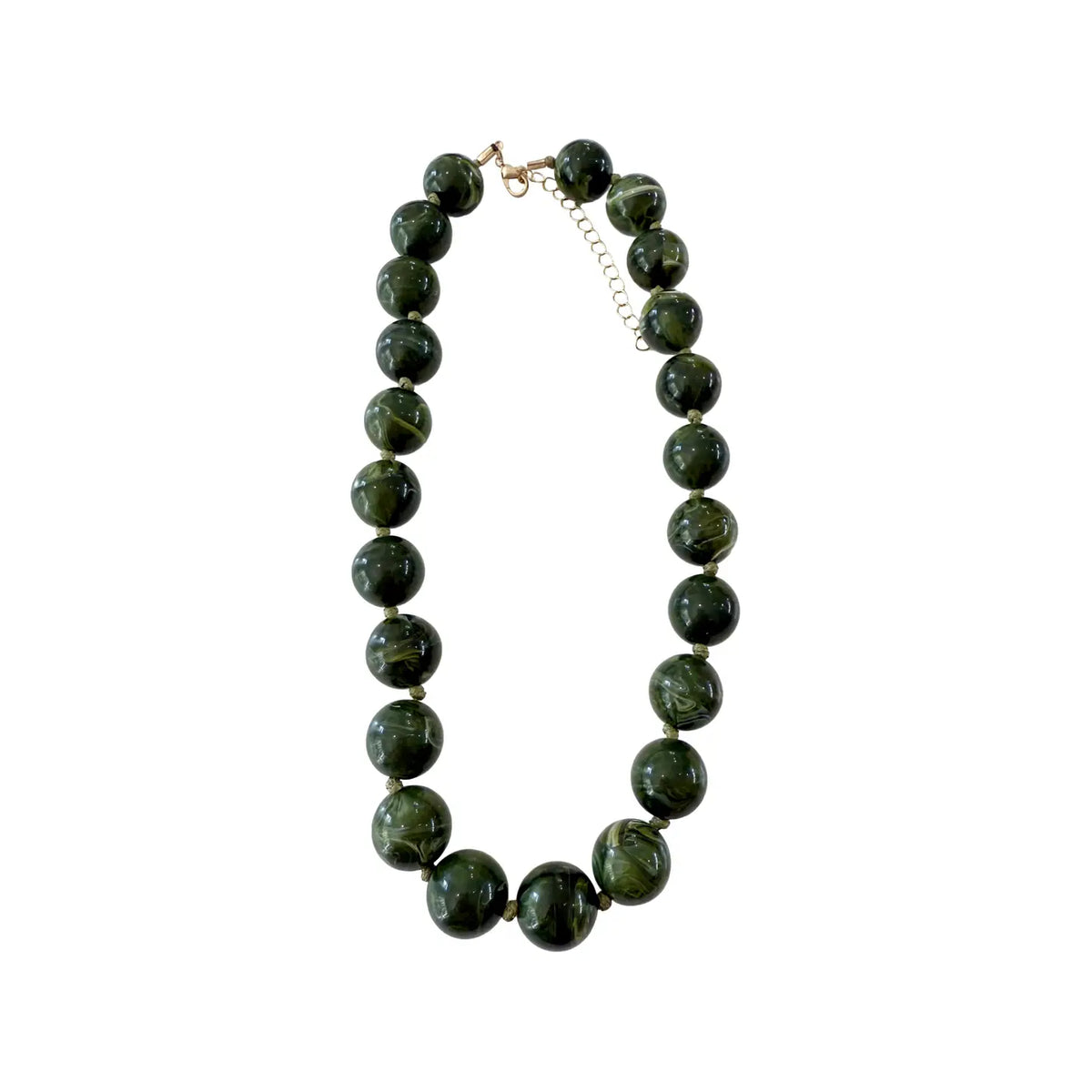 levate your look with this bold and timeless Mabry Beaded Statement Necklace. Featuring large, glossy marbled brown beads with natural variations and swirls, this piece brings a striking yet sophisticated edge to any outfit. The adjustable gold-tone clasp allows for the perfect fit, whether you’re styling it with a chic evening dress or a casual daytime look
