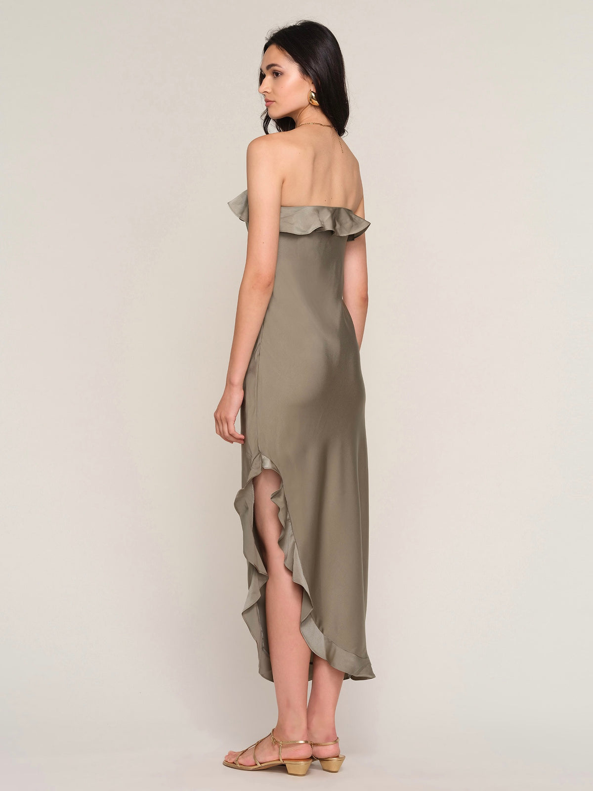 A gorgeous bias cut dress is a dreamy sage.  We love the stay-put fit of the top and flowy trim detail.