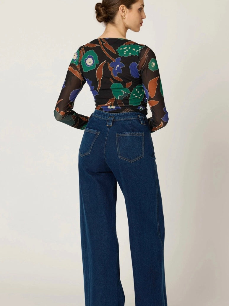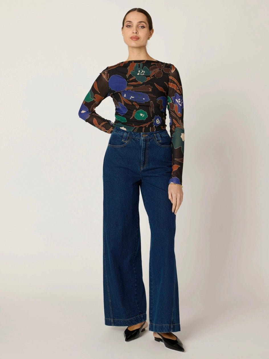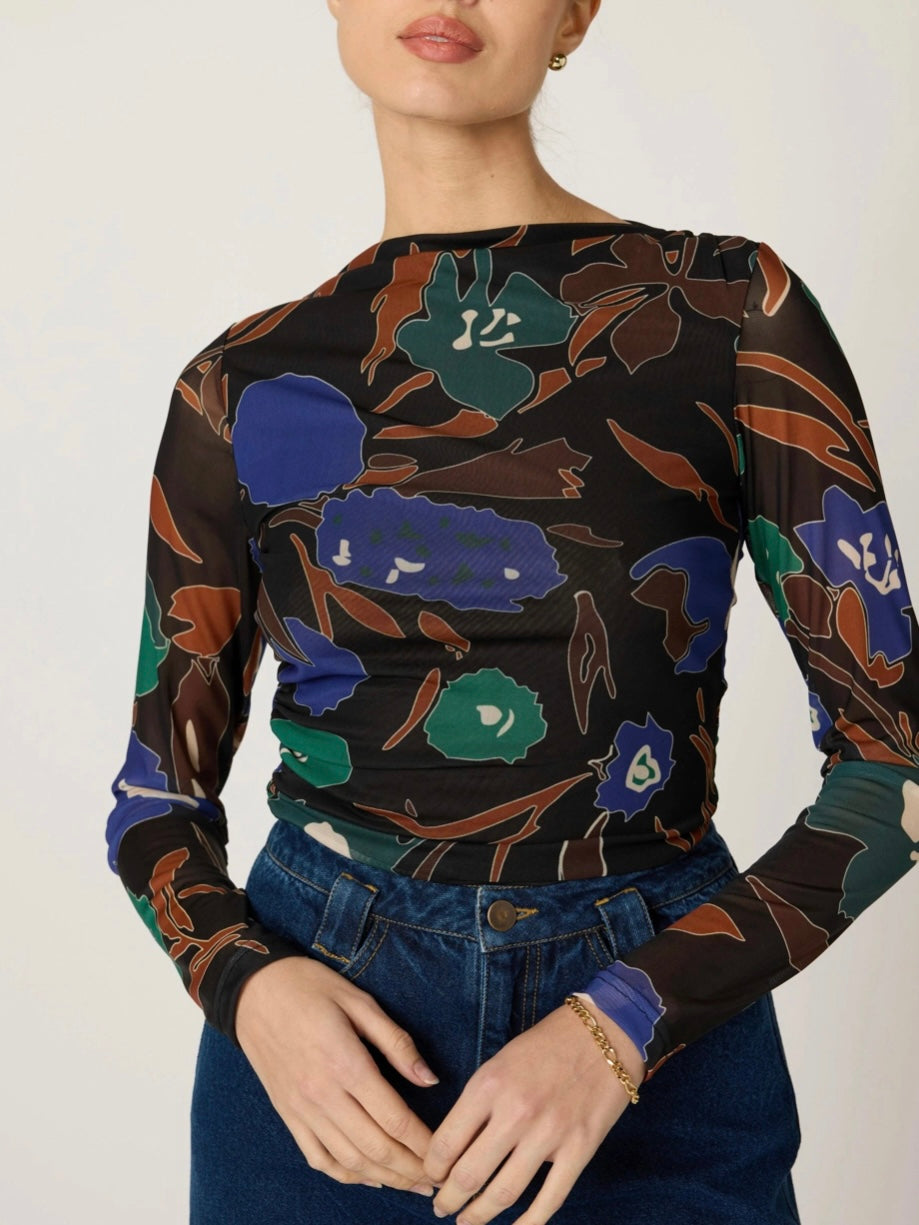 Ethically handmade in India from 88% nylon and 12% elastane, our best-selling Remy Top returns this fall in a dark floral Mariposa print. With its elegant high neckline and delicate shirring at the shoulders and waist, this flattering silhouette is a timeless piece designed to celebrate every body.