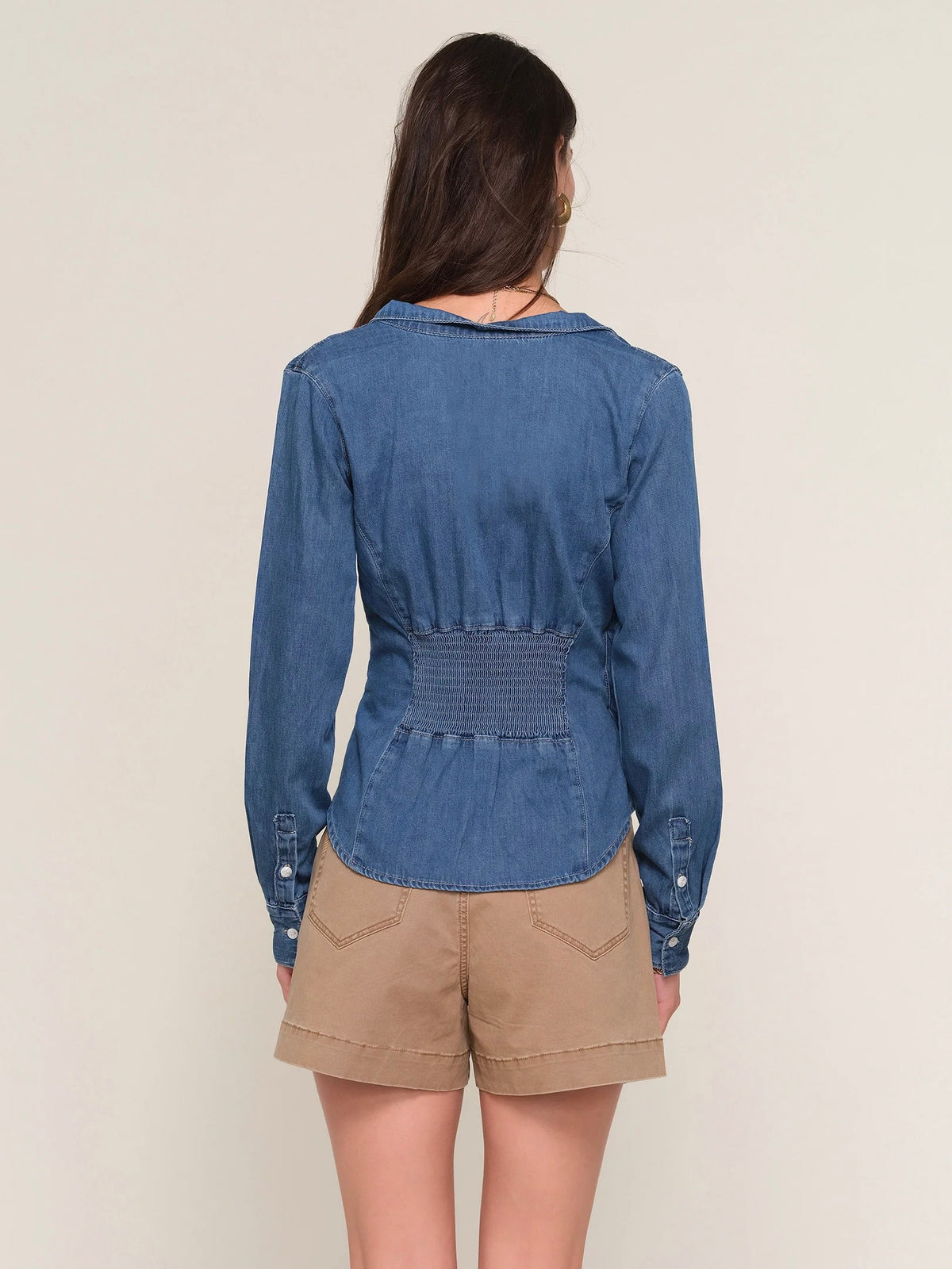 The Samira Top is a shirt with a twist. It features a super flattering wrap front and smocking at the back panel for the ultimate fit.