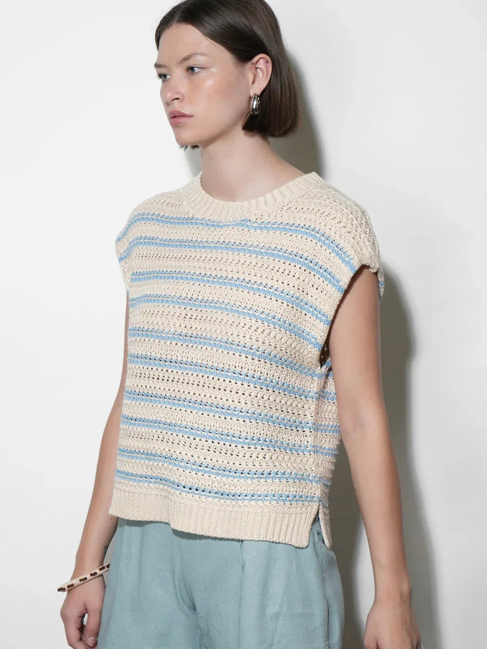 Typically featuring a sophisticated striped or color-blocked pattern, this piece uses the high-contrast duo to create a maritime-inspired look that never goes out of style. The boxy silhouette provides a contemporary, slightly oversized fit that hangs beautifully off the frame without losing its structure.