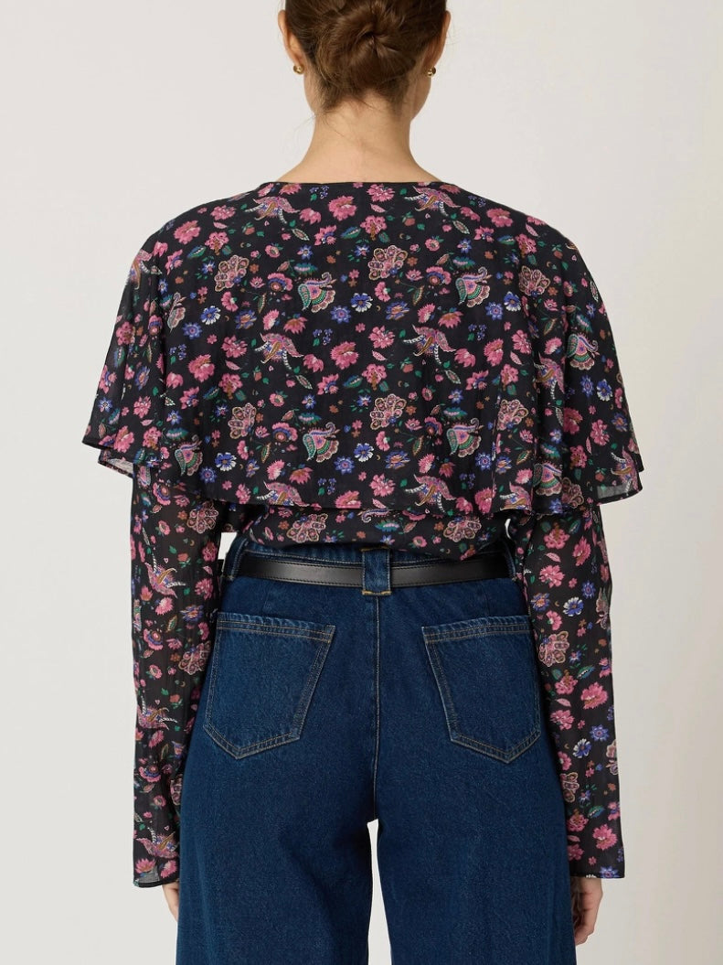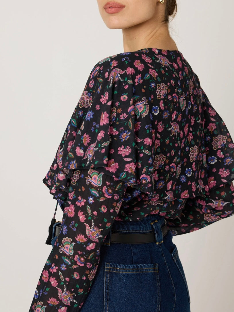 Ethically handmade in India, the Tyra Blouse features a delicate button-down front, romantic flutter sleeves, and a vibrant hand-drawn floral print set against a dark base for a striking contrast. Crafted from a lightweight, breathable cotton-viscose blend, this blouse transitions seamlessly from day to night — perfect for pairing with denim or tailoring for a refined yet playful look.