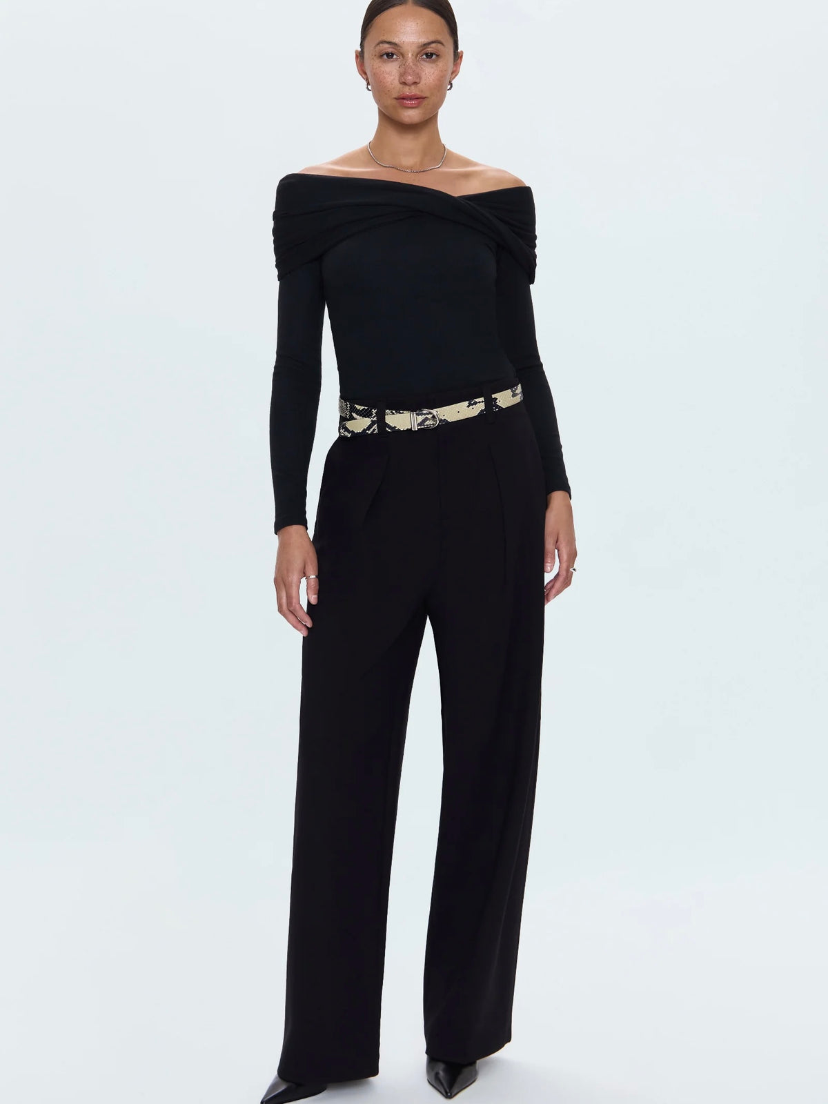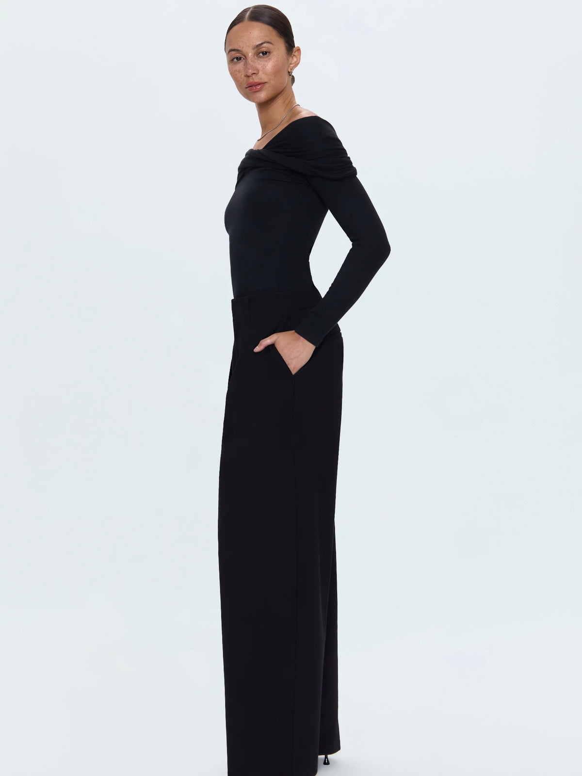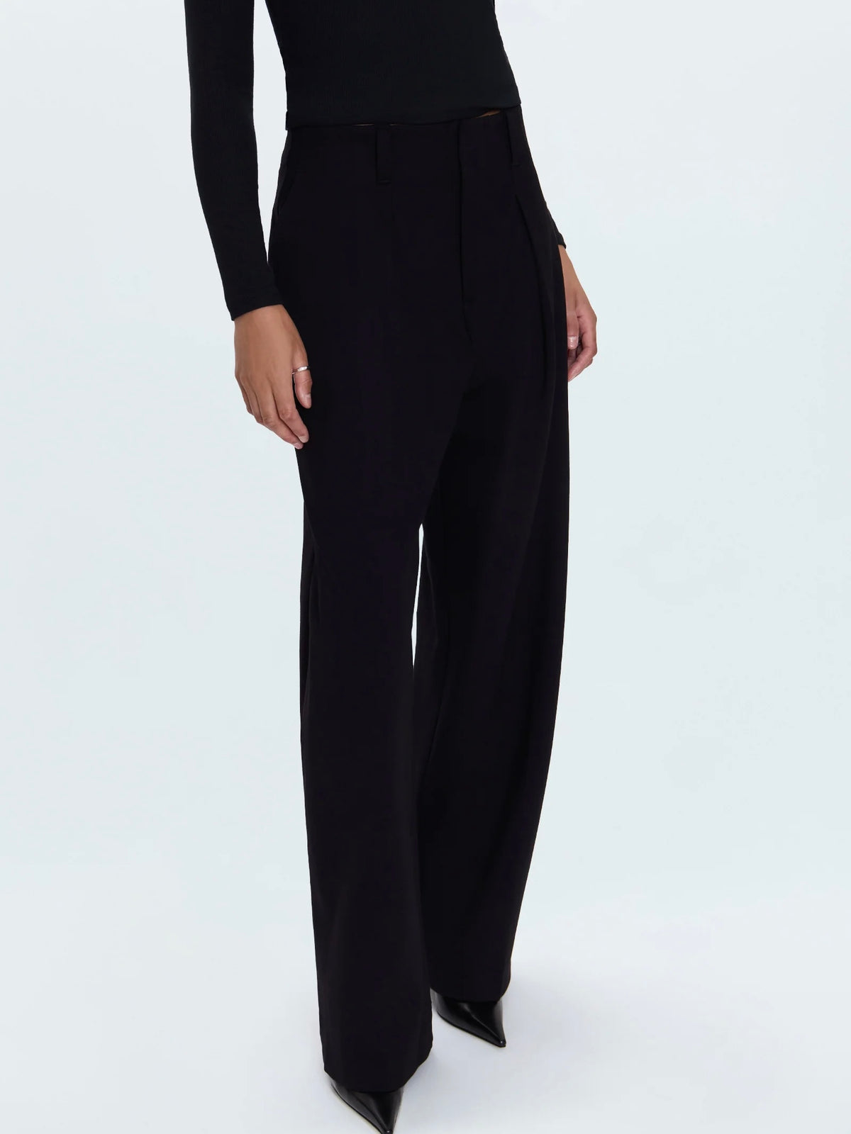 A tailored trouser, Eden features a high rise, sharp pleats, and a fluid wide leg for a modern take on classic tailoring. Cut from ponte fabric with subtle stretch, it balances structure and comfort for polished ease. Night Out, a deep black shade, offers timeless versatility from desk to dinner.