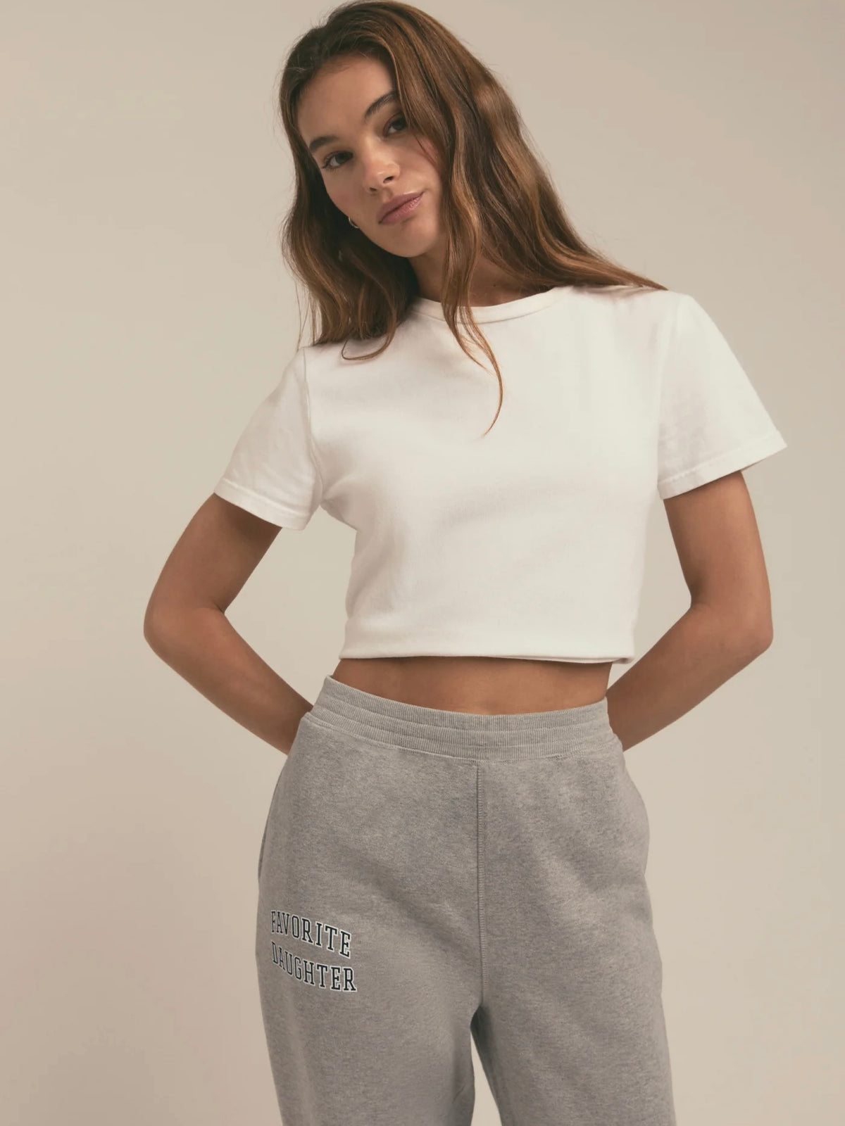 The comfiest pair ever constructed. The Collegiate Jogger is that super-soft favorite with all the style details-- Favorite Daughter logo (of course) and a relaxed, classic fit. Designed with a 31" inseam and an 11.5" rise for the perfect laid-back feel.