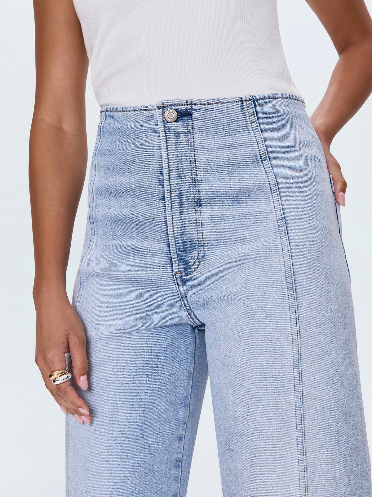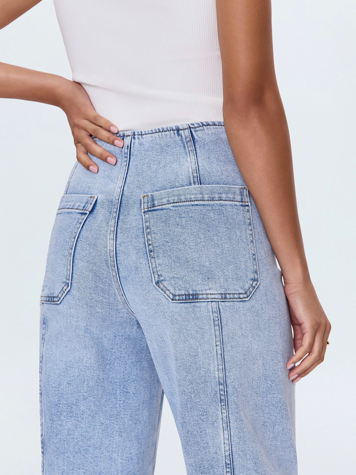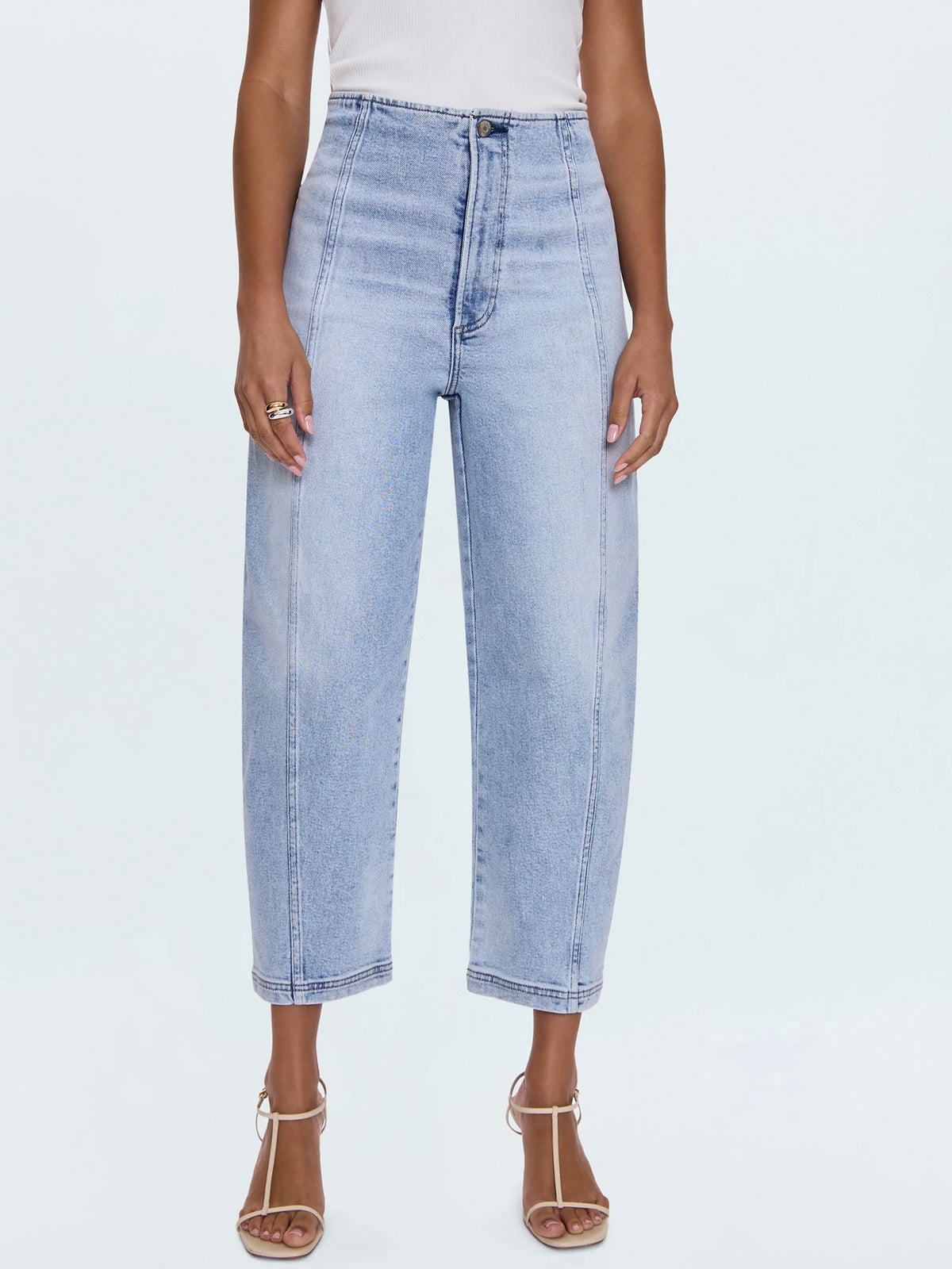 Meet your new favorite denim: our High-Rise Barrel Leg jeans. The unique shape offers a modern twist, while the absence of a waistband creates a smooth, streamlined silhouette that feels inherently sophisticated. Notice the chic seaming details – a thoughtful touch that adds an elevated flare. Cut to a flattering ankle length, they're the perfect partner for your favorite heels. Finished in an easy light wash, these jeans promise to be a versatile staple you'll reach for day after day, effortlessly transitioning from casual outings to dressier occasions.