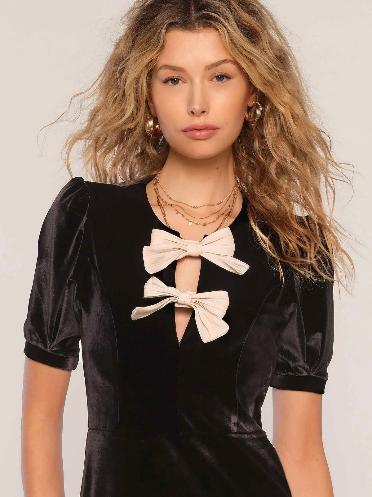 The Davilla Dress is made from our softest velvet, with slight stretch. It features two contrast bows, crew neck and a slight puff sleeve. It has a slim, waisted fit.