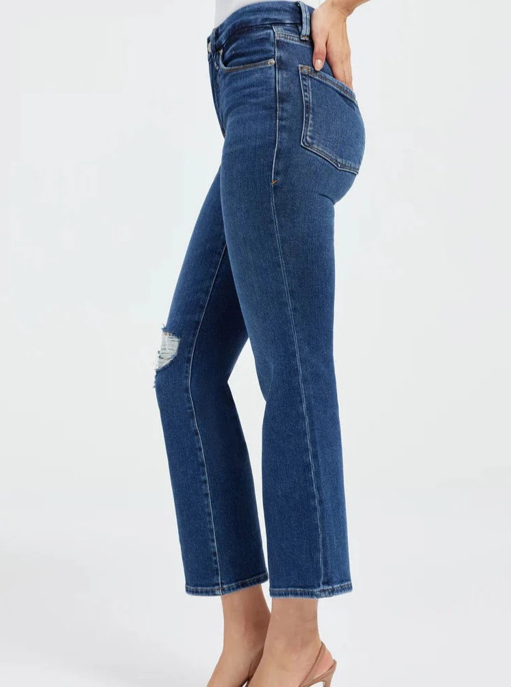 Good American's #1 best selling high rise denim in a cropped silhouette and classic medium dark blue distressed wash. Its the ultimate sculpting jean with flat tummy tech, and a gap-proof waistband in super stretch denim that's sure to flatter every curve.
