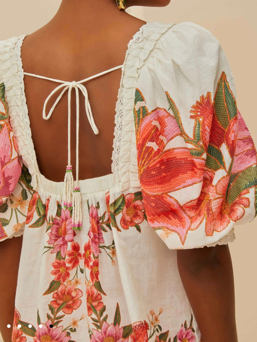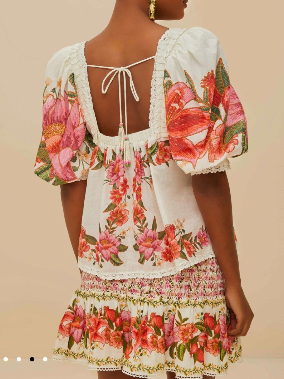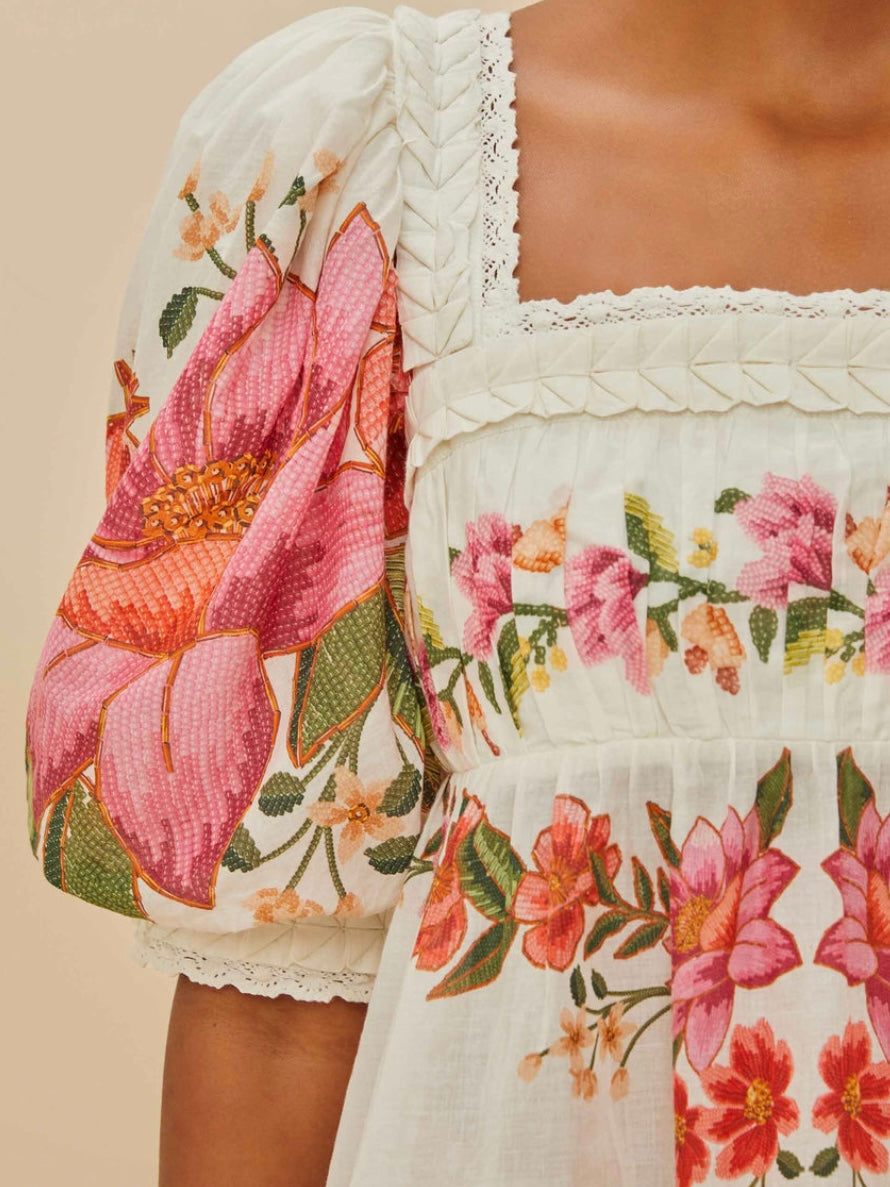 Step into sunlit days with the off-white summer fruit blouse by FARM Rio. This masterpiece showcases vibrant floral patterns that dance across a gentle off-white canvas. The square neckline introduces a classic touch, while voluminous sleeves add playful flair. Intricate lace and a charming back tie complete the picture of breezy sophistication. Perfect for those who embrace color and joy in every stitch.