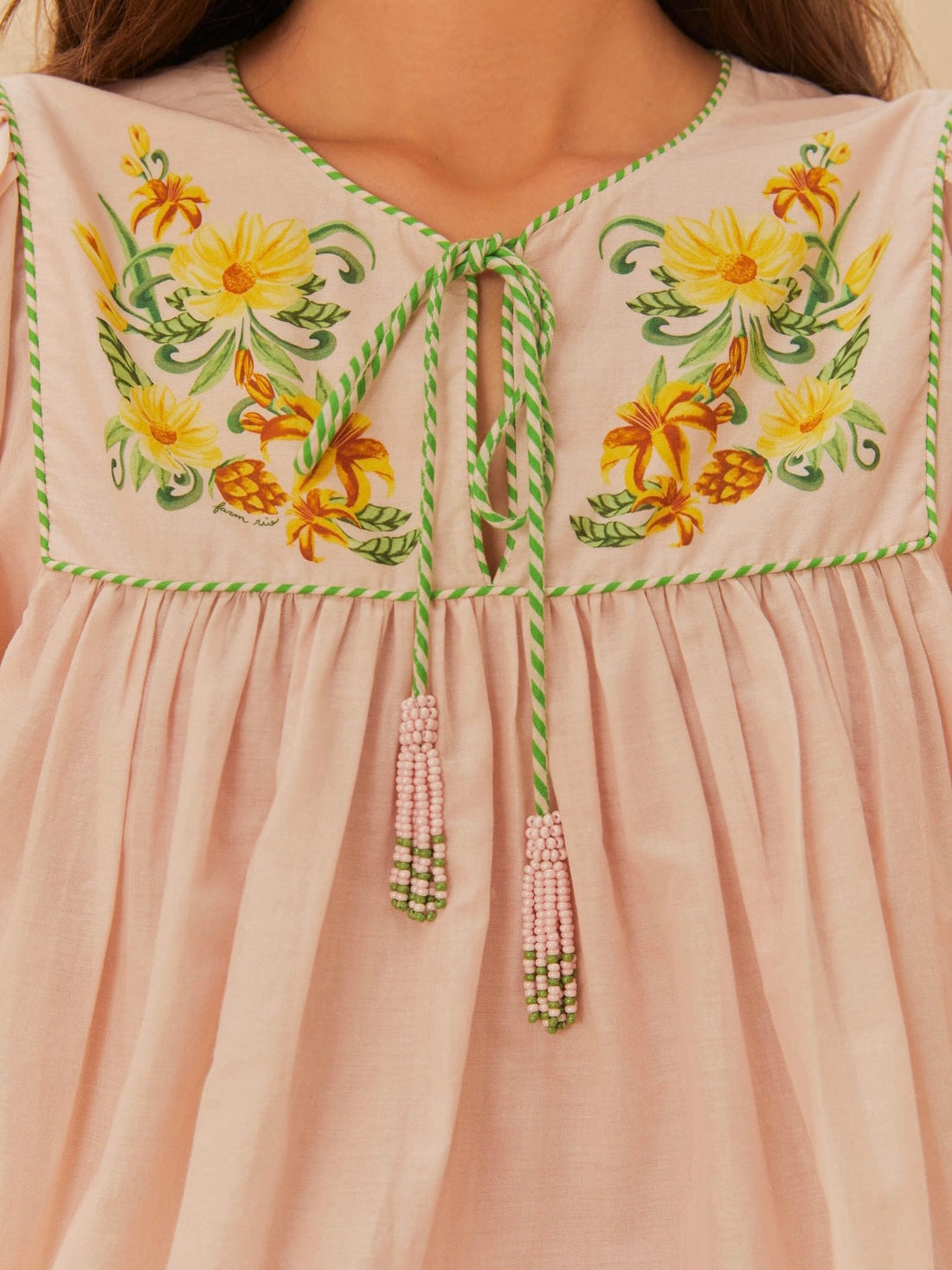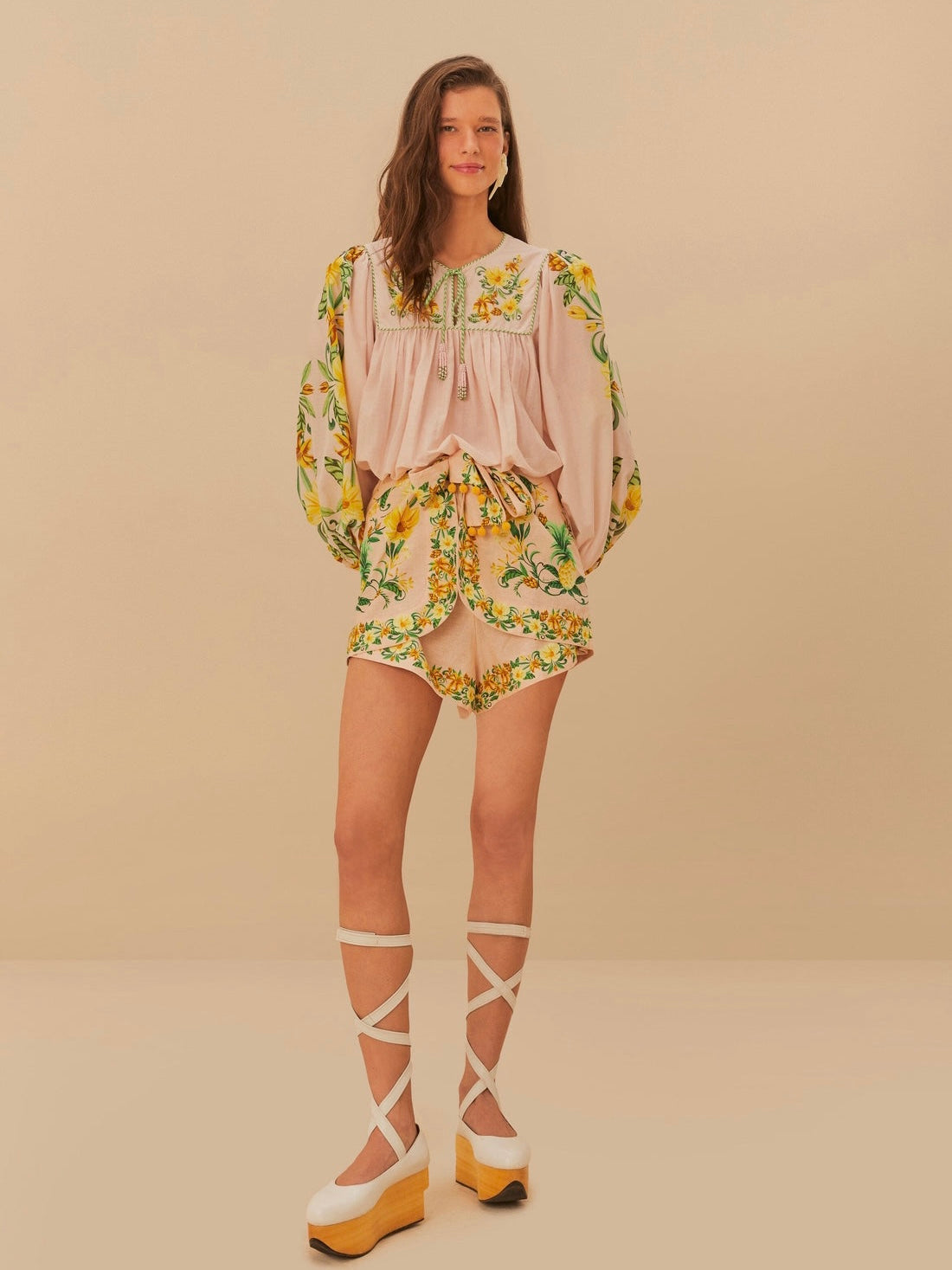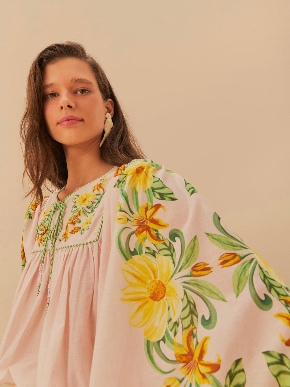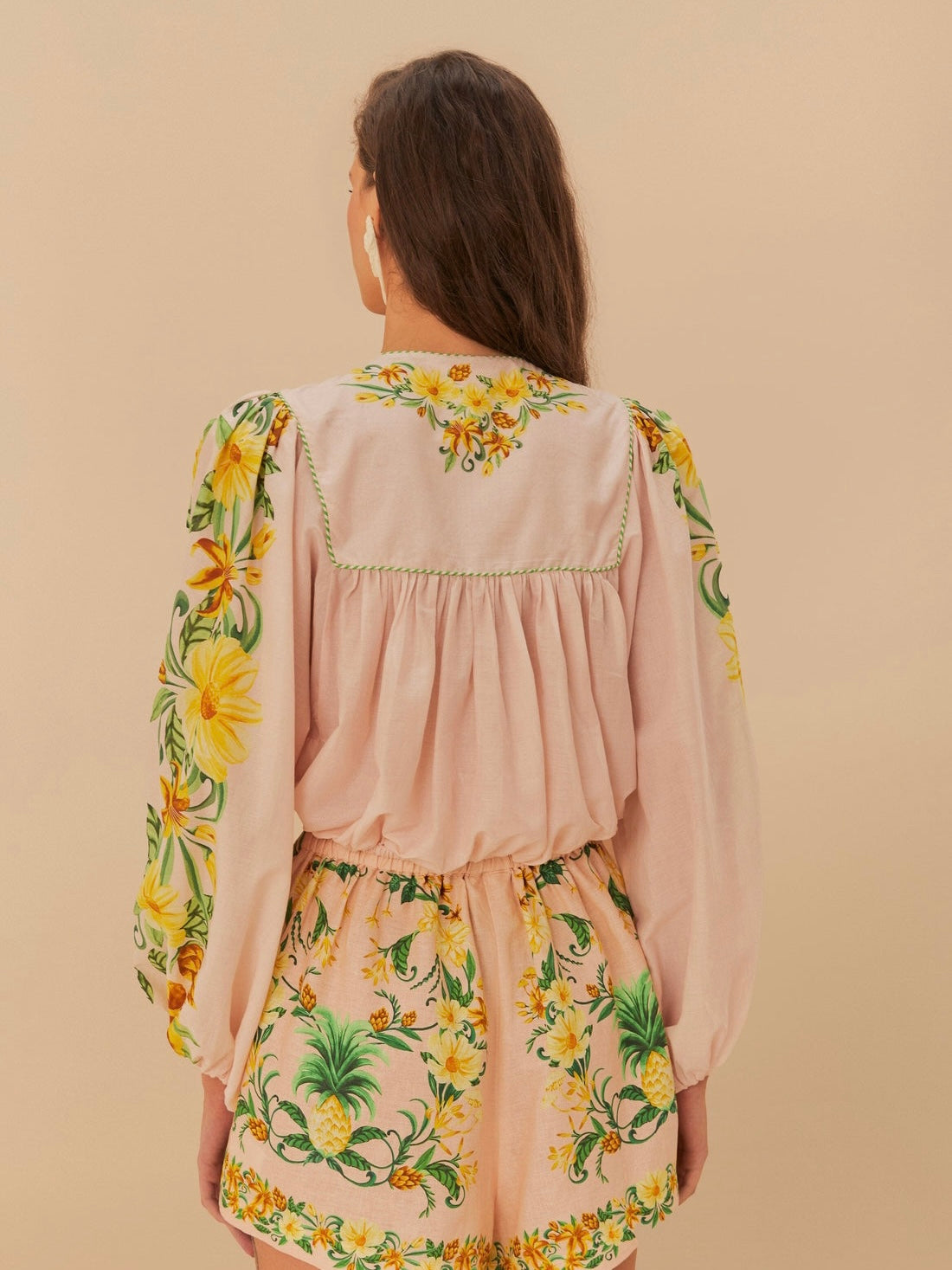 Embrace the vibrant charm of the Pink Botanical Beauty long sleeve blouse by FARM Rio. This exquisite piece showcases a delicate round neckline and intricate floral embroidery, enhanced by lively botanicals in lush greens and yellows. The voluminous sleeves add a playful twist, while the soft pink fabric creates a gentle, flowing silhouette. Perfect for adding a splash of tropical elegance to your everyday look.