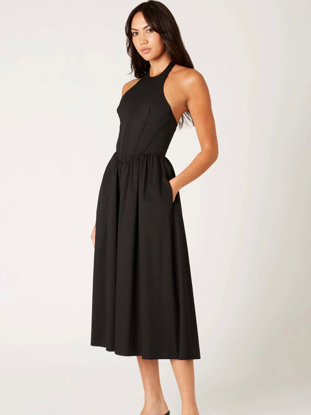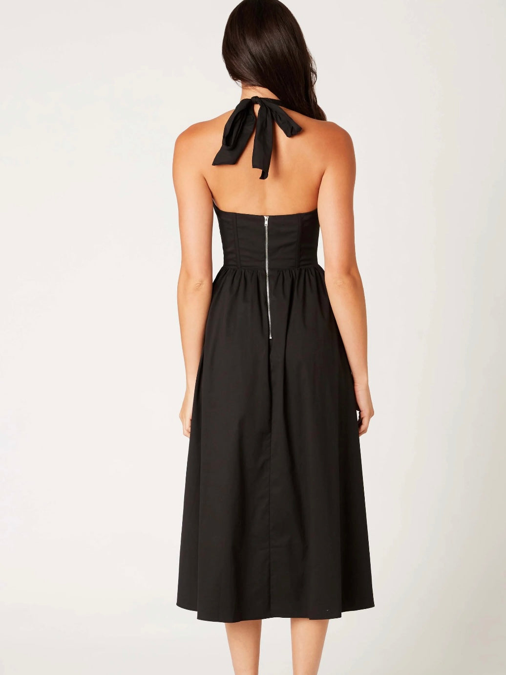 A halter-neck poplin midi dress featuring a corset bodice and full skirt. We love it with a simple heel and earring for a night out. Add a denim jacket for an easy, fun look!
