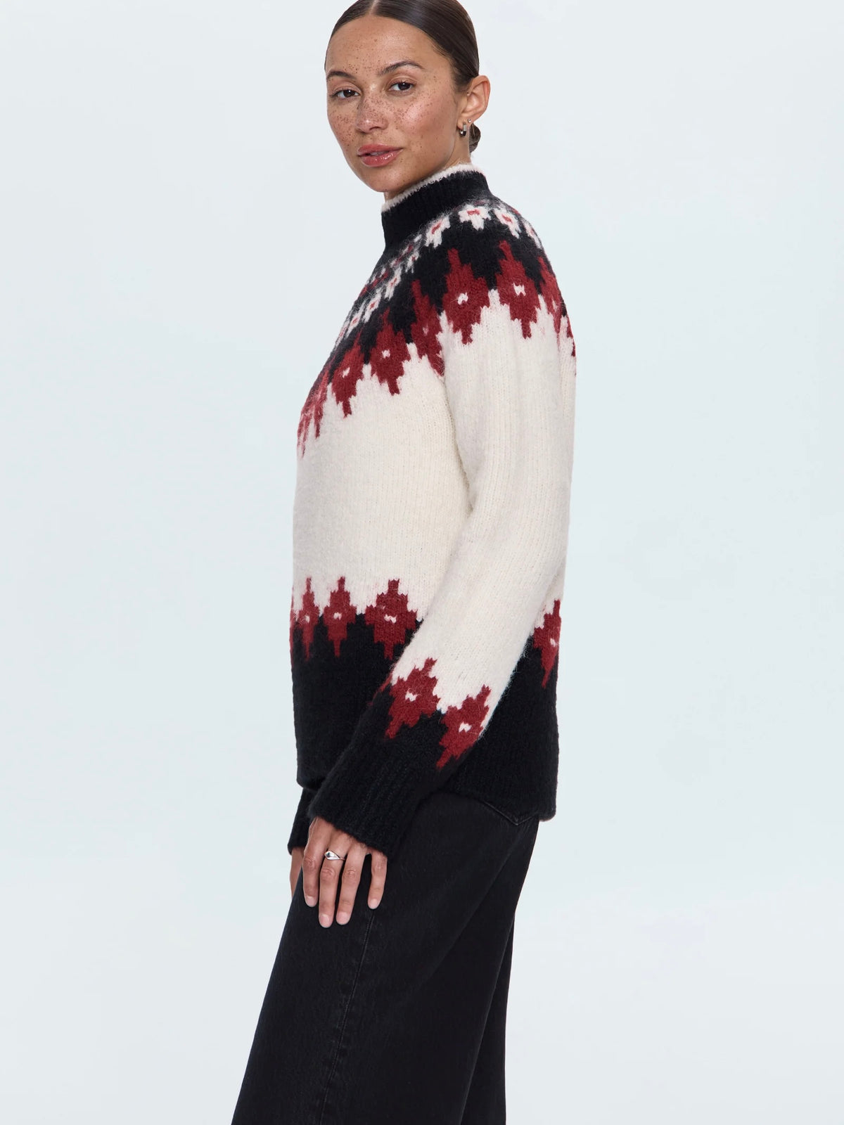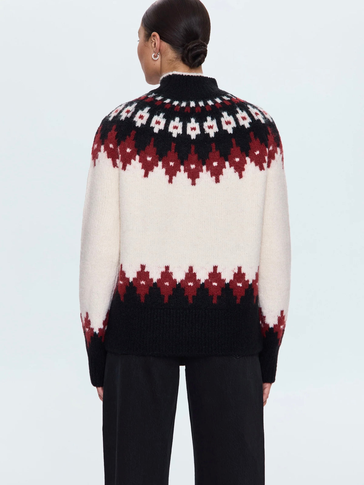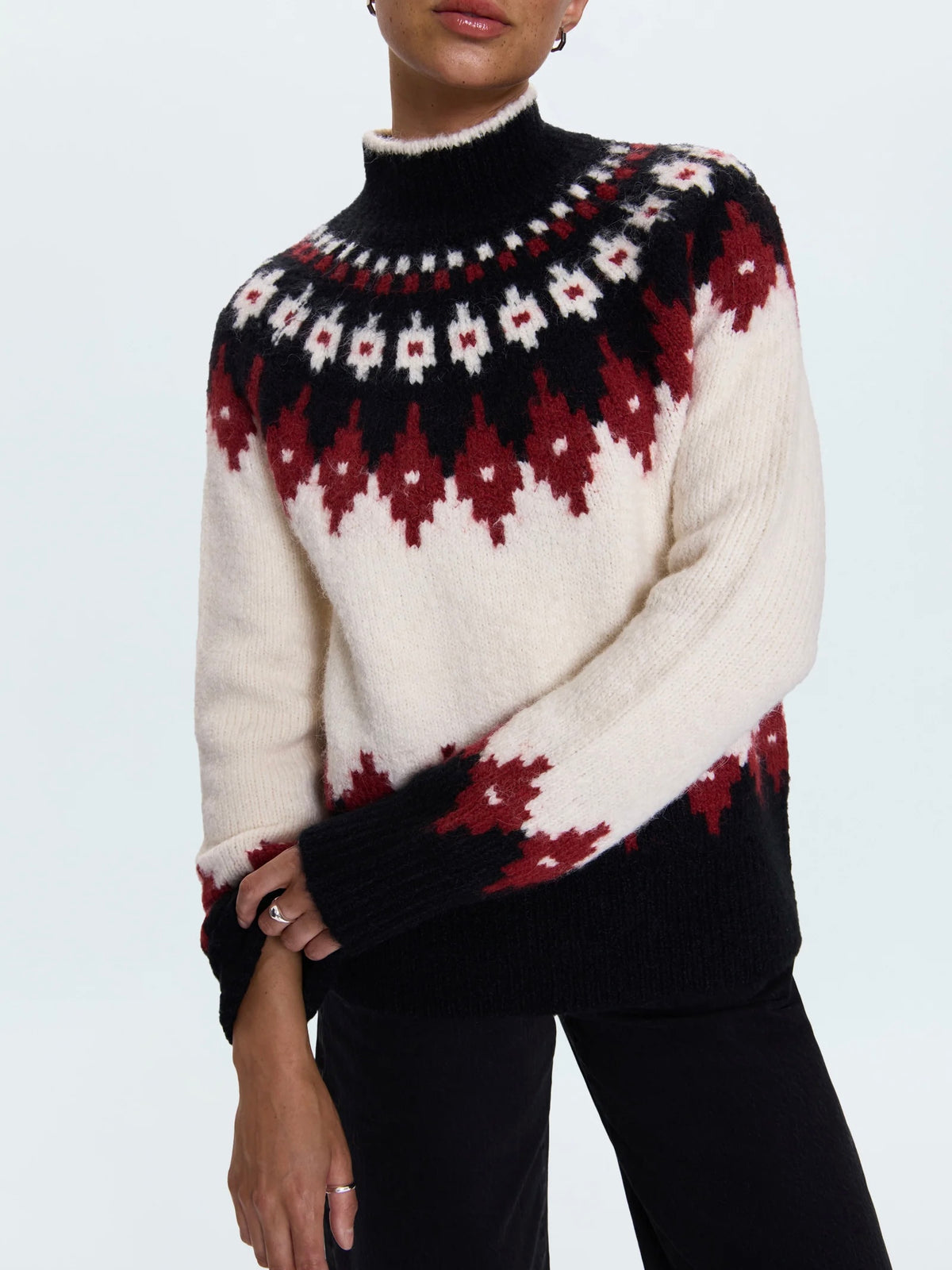 A modern update to a heritage knit, Astrid reimagines the classic Fair Isle with bold contrast tones and an easy pullover fit that feels equal parts cozy and refined. Crafted from a soft, substantial blend of acrylic, wool, alpaca, and nylon. White Oxblood Fair Isle brings a graphic contrast that transitions effortlessly from après-ski to city days.