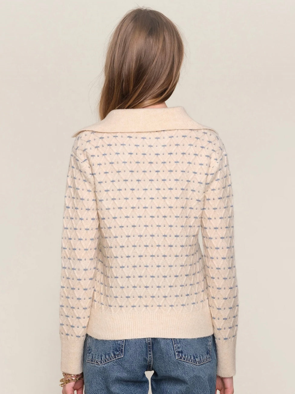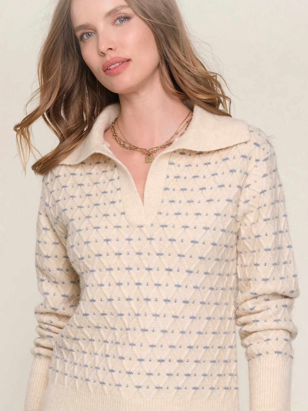 The Farrow Sweater is a relaxed fit, polo top. It features a pretty diamond stitch throughout the body. Throw on with a pair of jeans for a cozy, soft look.