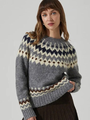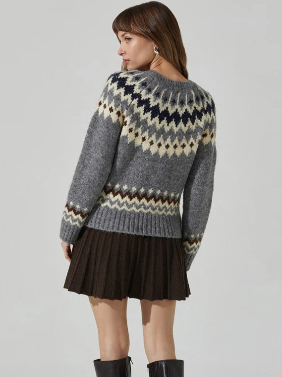 A gorgeous, chunky fair isle sweater to wear now and later! We love it paired with a jean and boot or a pleated skirt and tights. Gorgeous!