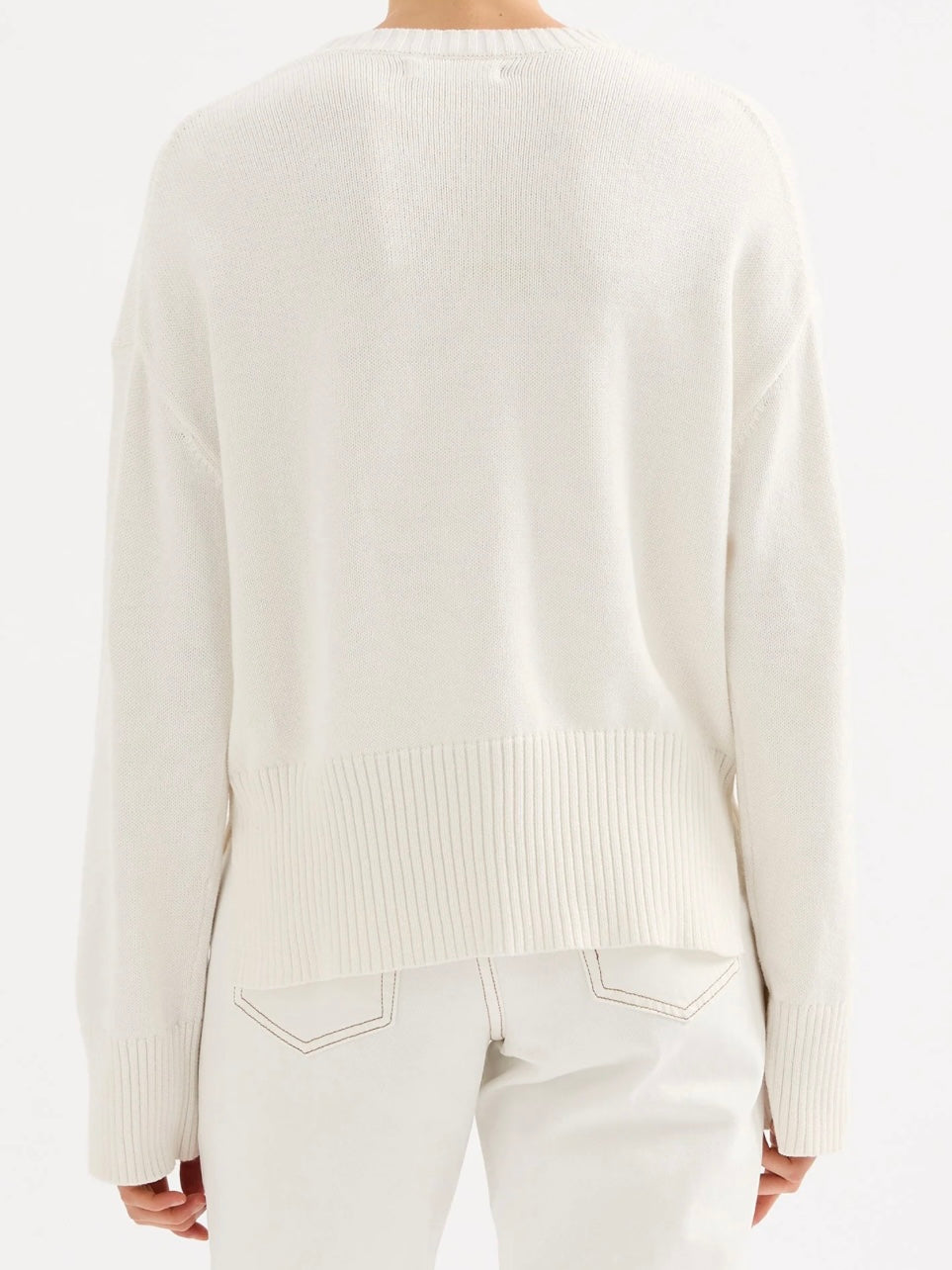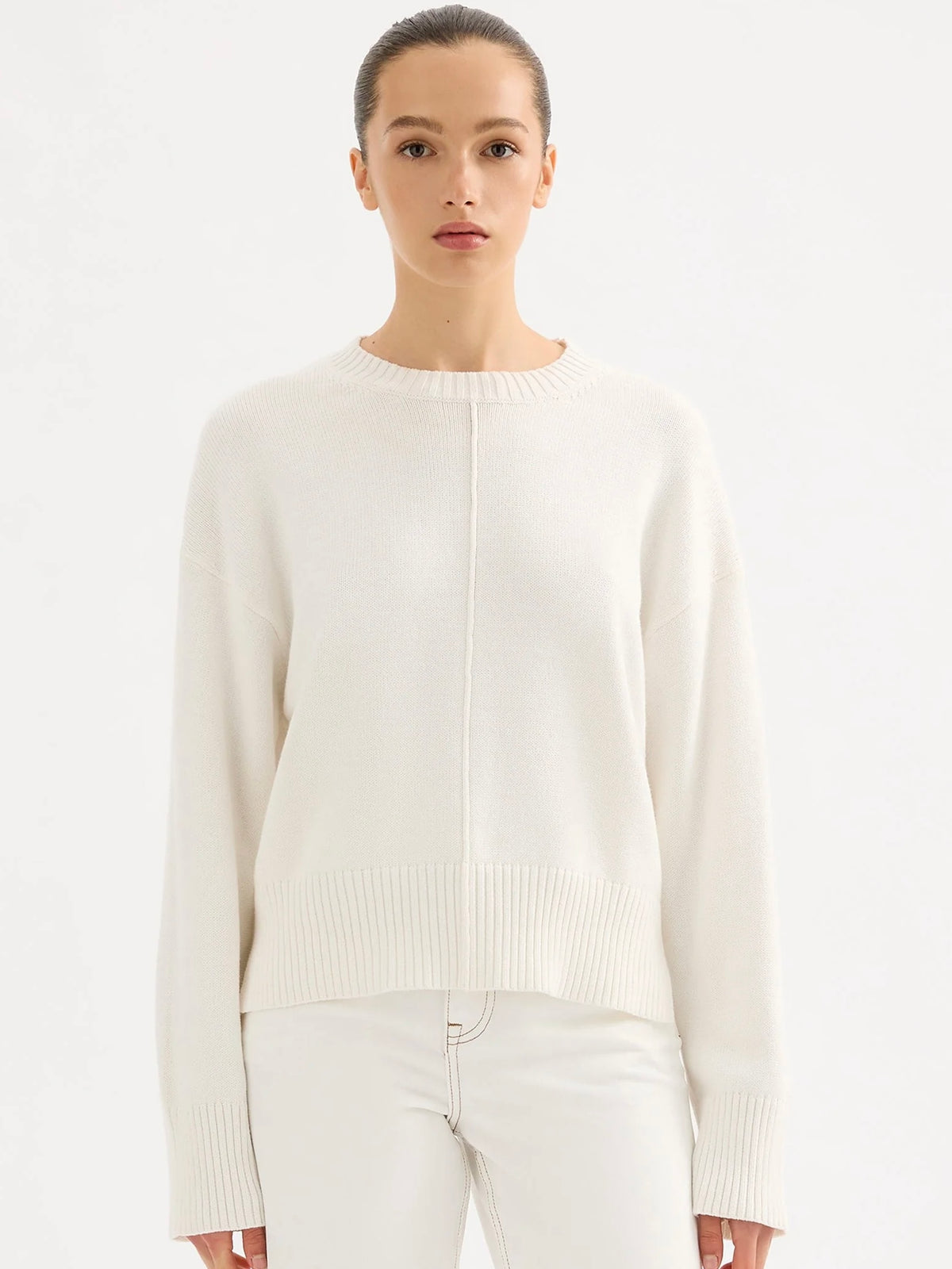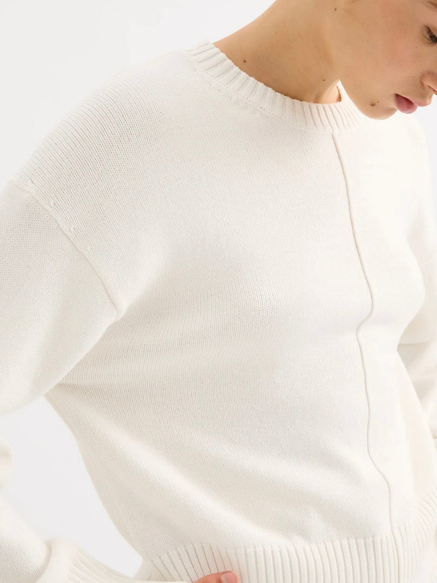 The Juno Knit is made from a cotton yarn which has a dry hand feel. The silhouette is relaxed with a crew neckline and length finishing at the hips. Features include dropped shoulders, rib around collar, hem and cuff.
