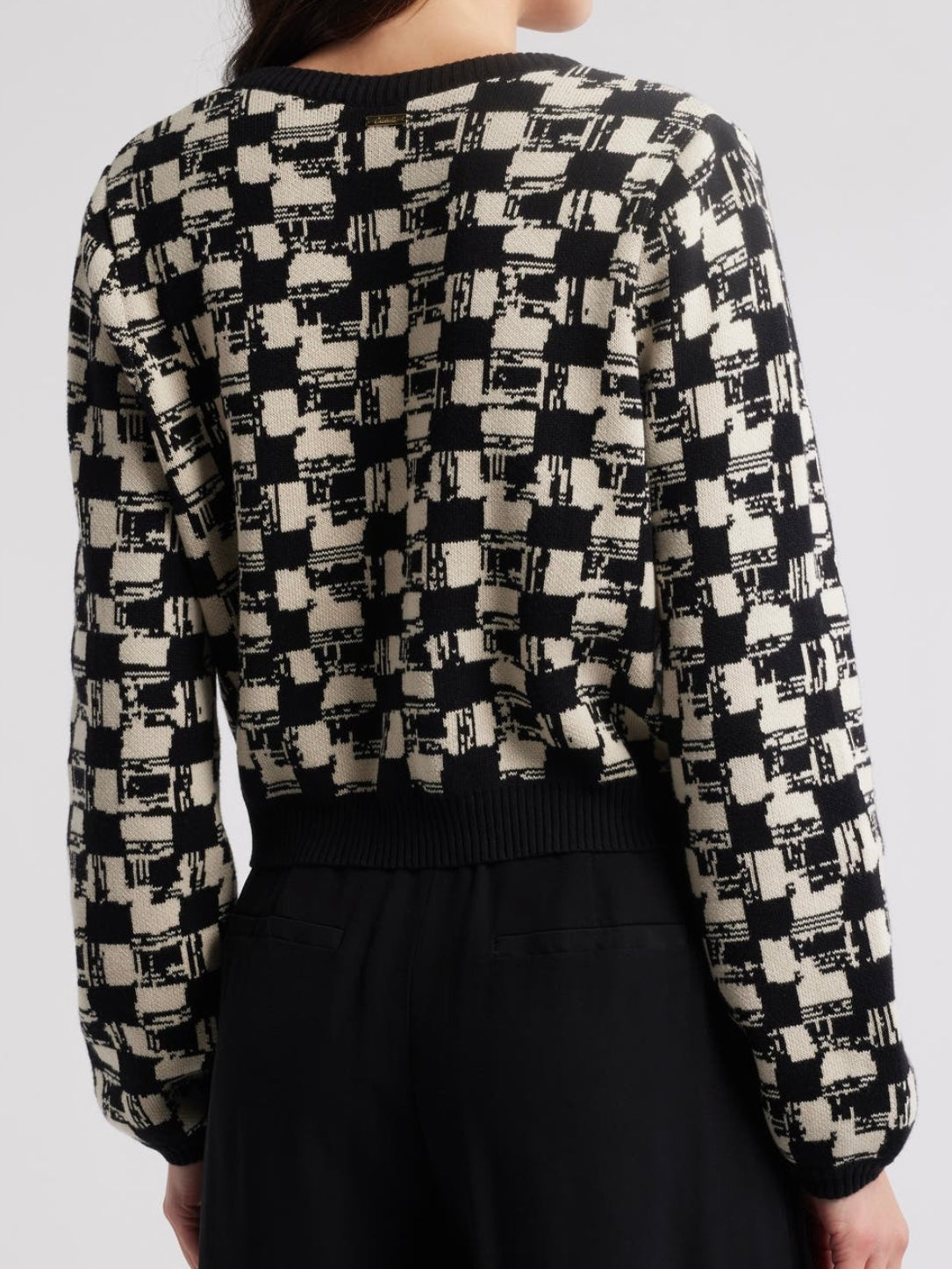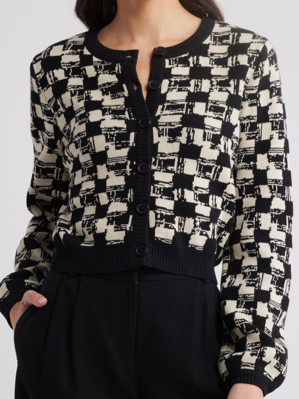Introducing The Marybeth Cardigan, made of 100% cotton yarn. In our Biarritz Jacquard, this sweater features a button closure down the center front and a cropped silhouette.