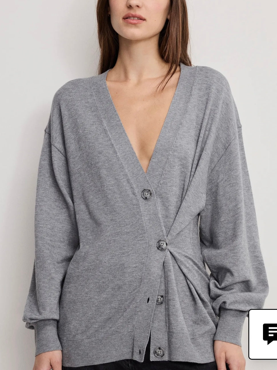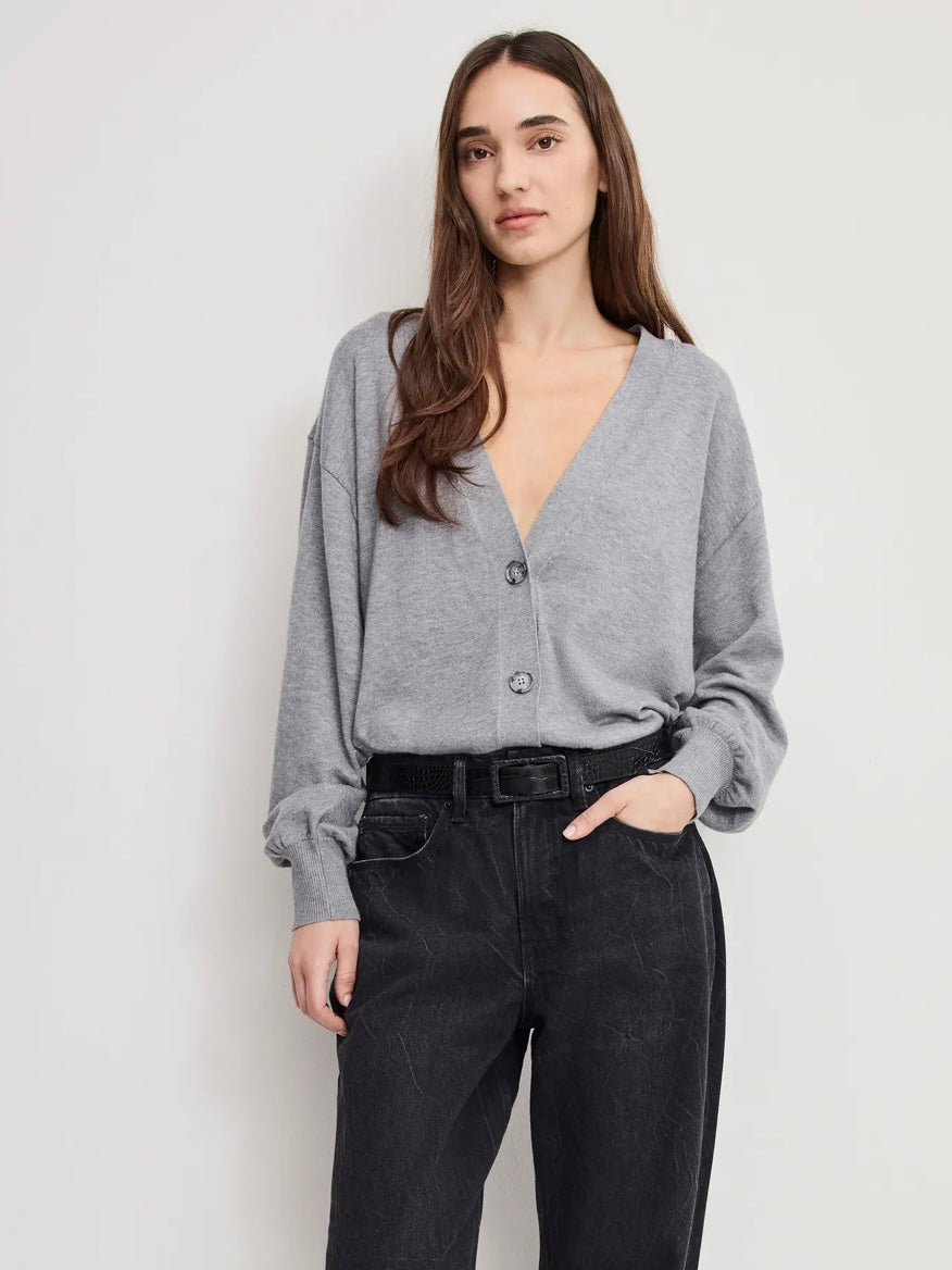 A side button detail gives versatile styling options to this soft cardigan designed with a deep V-neckline and relaxed long sleeves.
