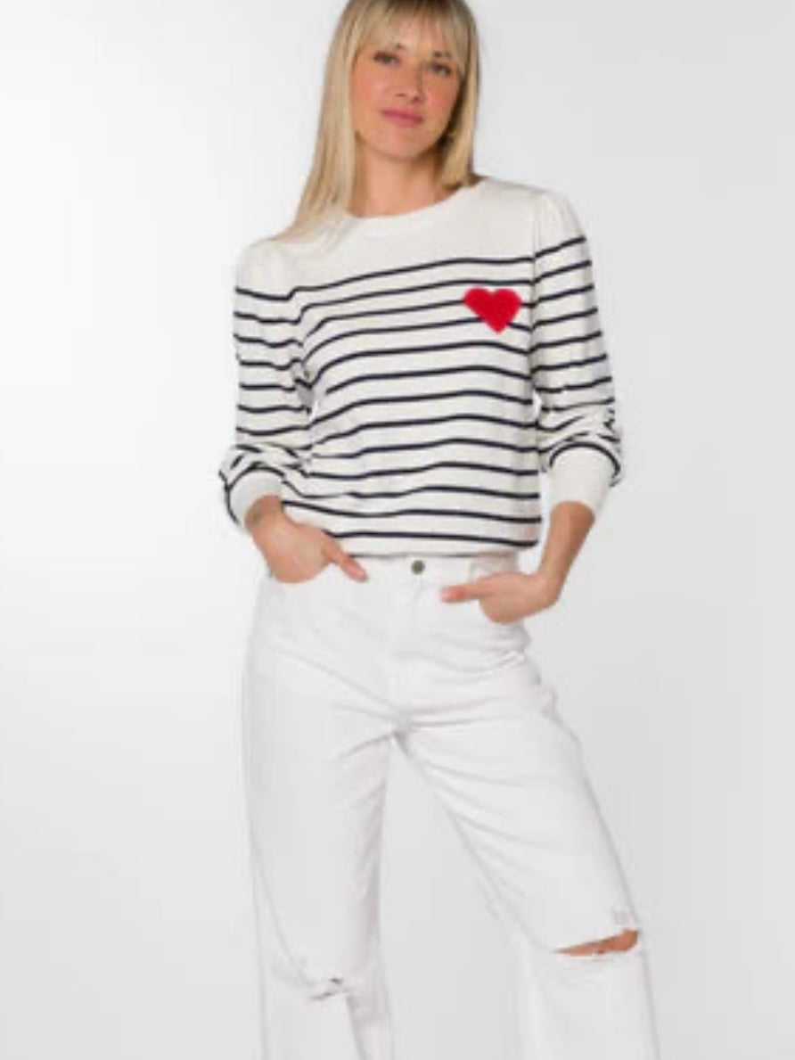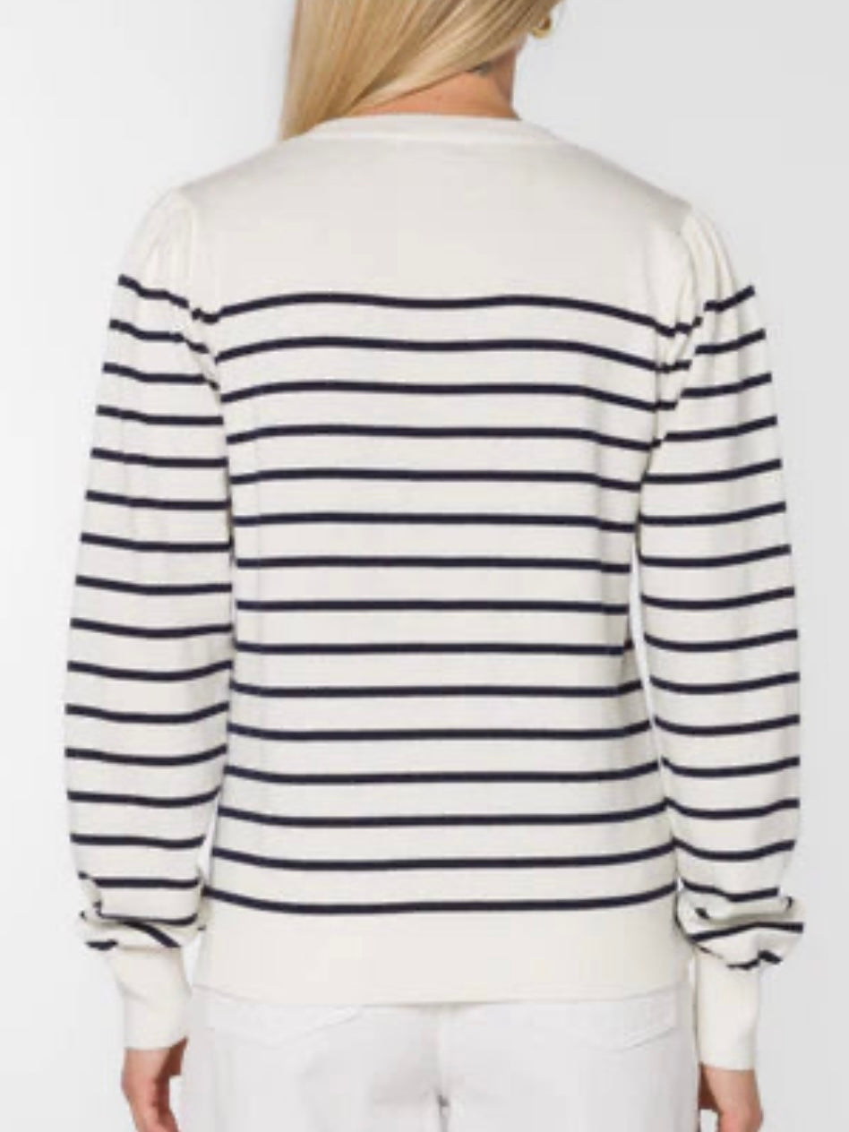 This long sleeve crewneck sweater features a stylish striped design with a shirred shoulder detail. Made from high-quality materials, it offers both comfort and durability. Elevate your wardrobe with this versatile and trendy Serissa Ecru Navy Stripe Sweater.