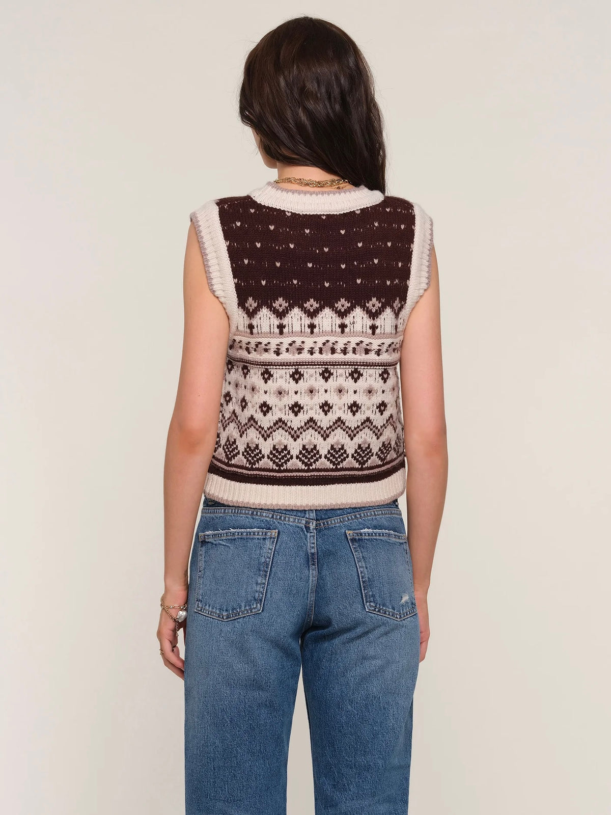 The Vivi Vest is a sweet, knit vest with a wintery patter throughout the body. It has a relaxed fit and a crew neck. We love it worn alone or layered over a long sleeve tee.