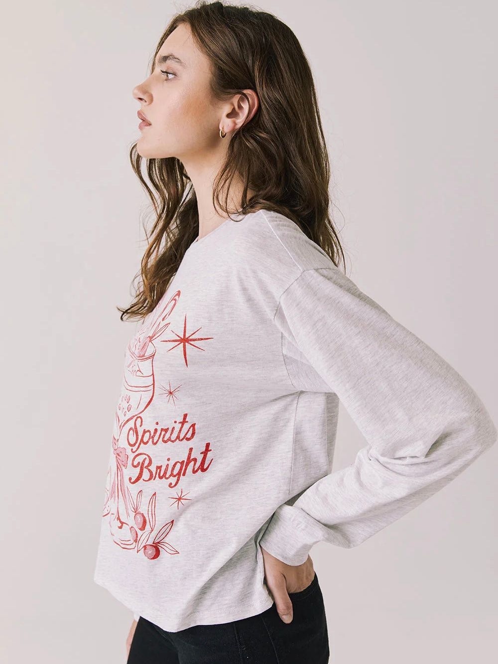 Step into the season’s charm with the Spirits Bright Long Sleeve, featuring a retro-inspired print of a champagne coupe and candy that captures festive delight.