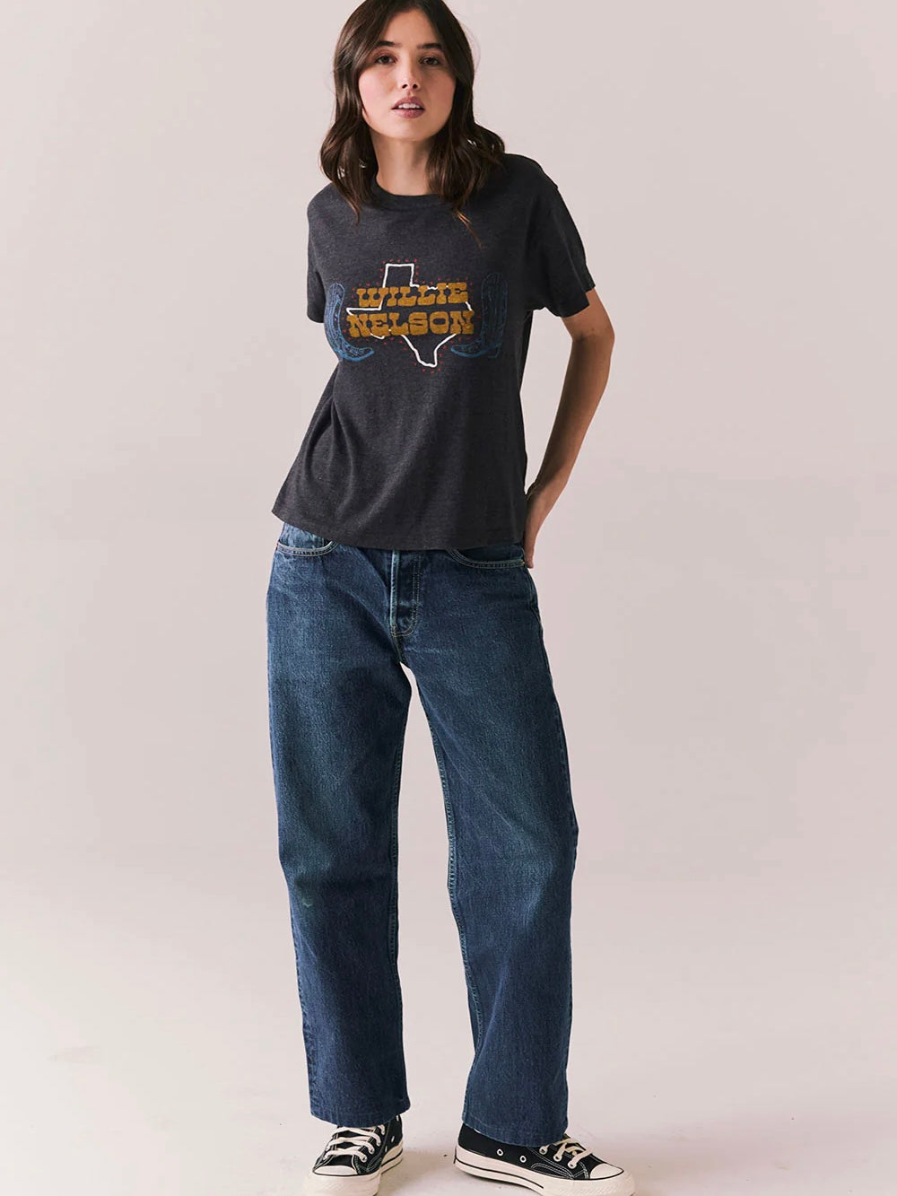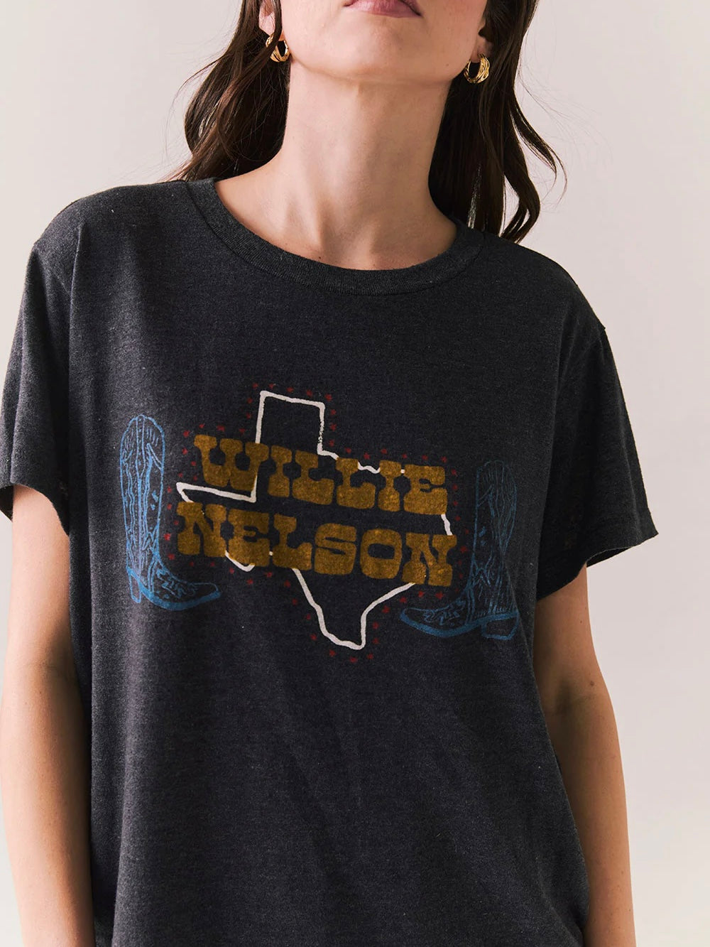 Featuring Willie Nelson’s name in a classic Western font, this tee showcases a cheeky off-centered blue boot design alongside a map of Texas.