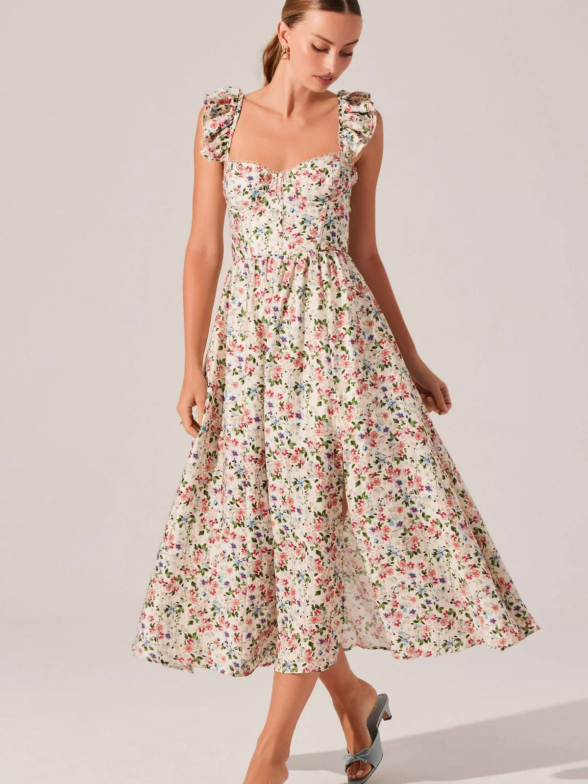 - Ruffle sleeves, adjustable straps